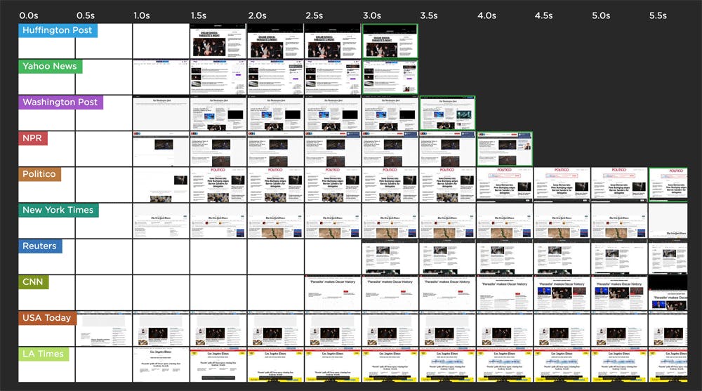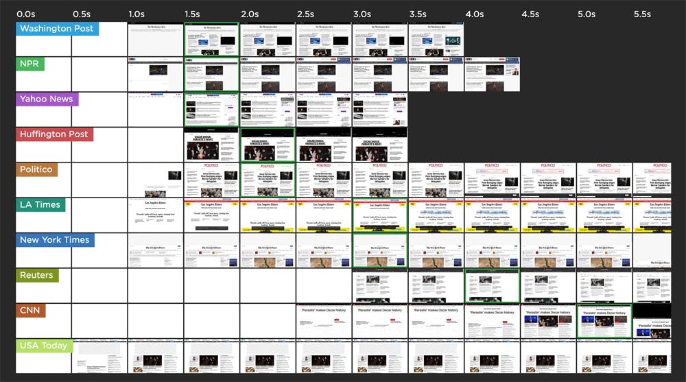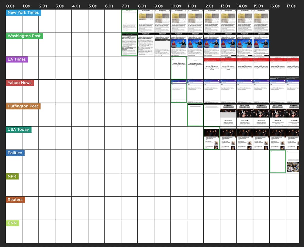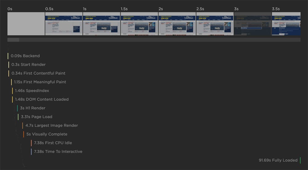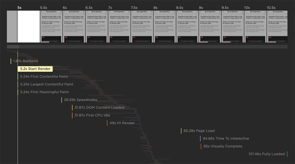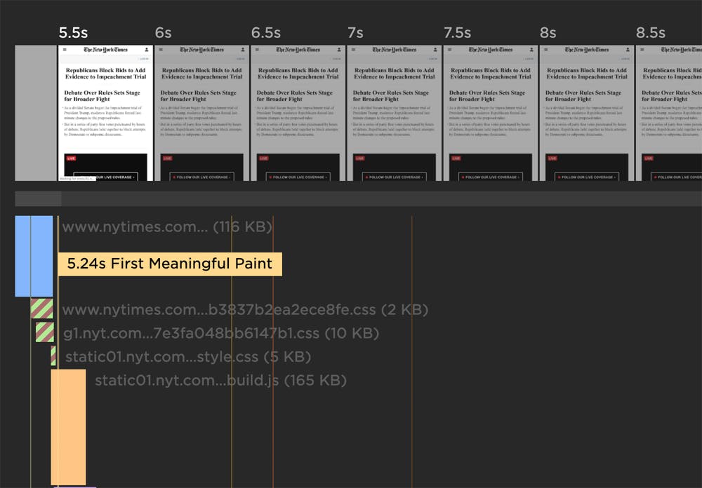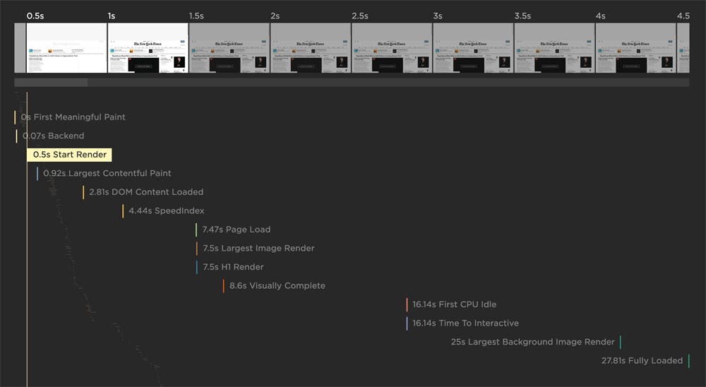 This takes us to a detailed test result for The New York Times, where we can see how popular rendering metrics align with the filmstrip. What’s great to see here is that, despite the total size of this page, the filmstrip view shows that it actually renders pretty quickly – yay!