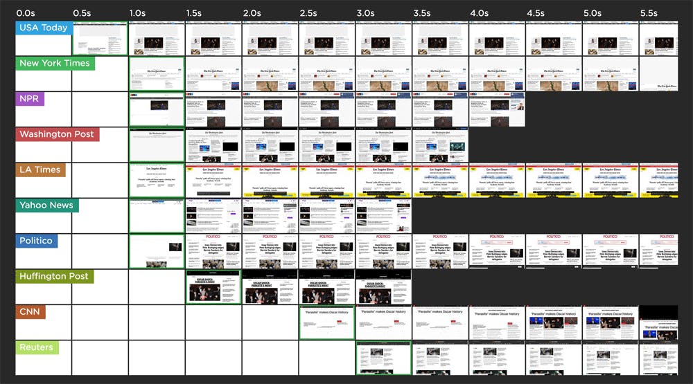 Let’s start by looking at the results for US media sites on a fast desktop connection. This is an interesting group to start with because these sites face some aggressive performance challenges: