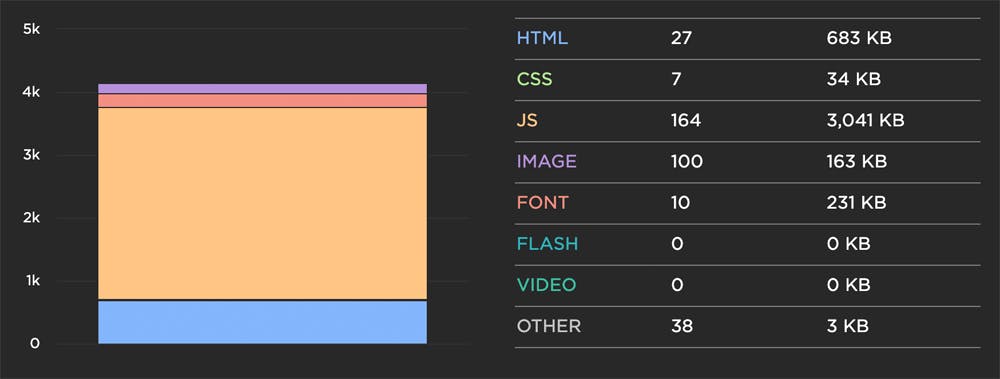 The not-so-good news is that the page is still over 4MB in size, with around 3MB of that coming from JavaScript alone. I’m pretty surprised to see that, as I really expected the bulk of the weight to come from images. Image weight comes in at 163KB, which is good by any standard.