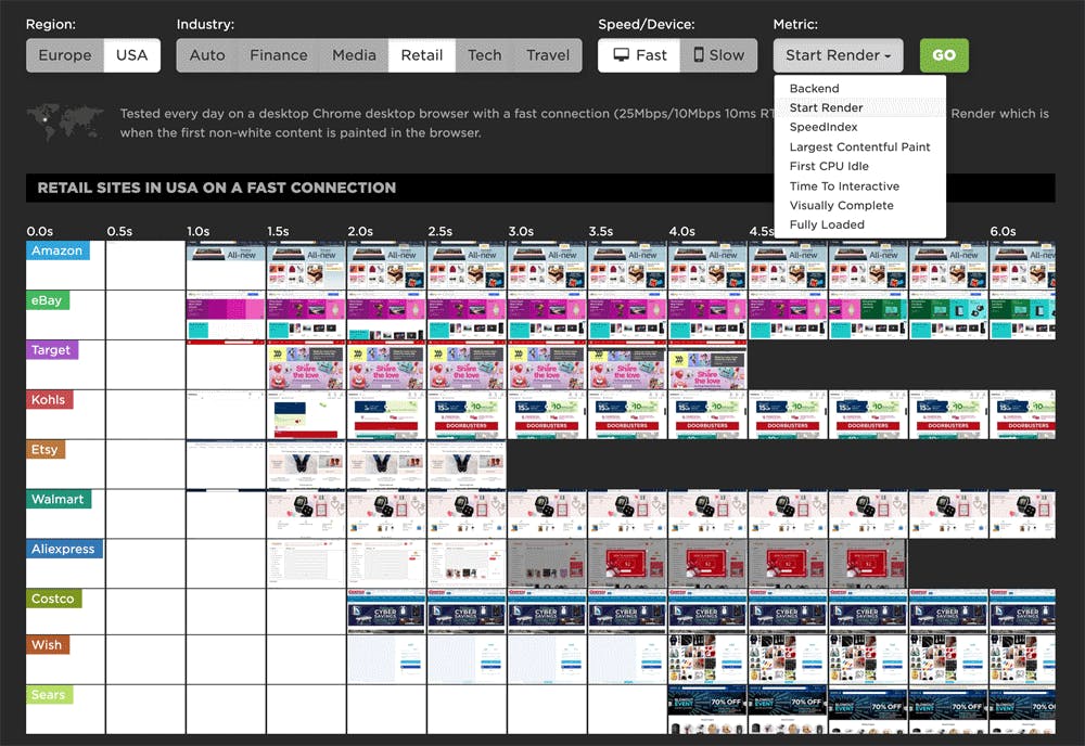 Page Speed Benchmarks is an interactive dashboard that lets you explore and compare web performance data for leading websites across several industries – from retail to media.