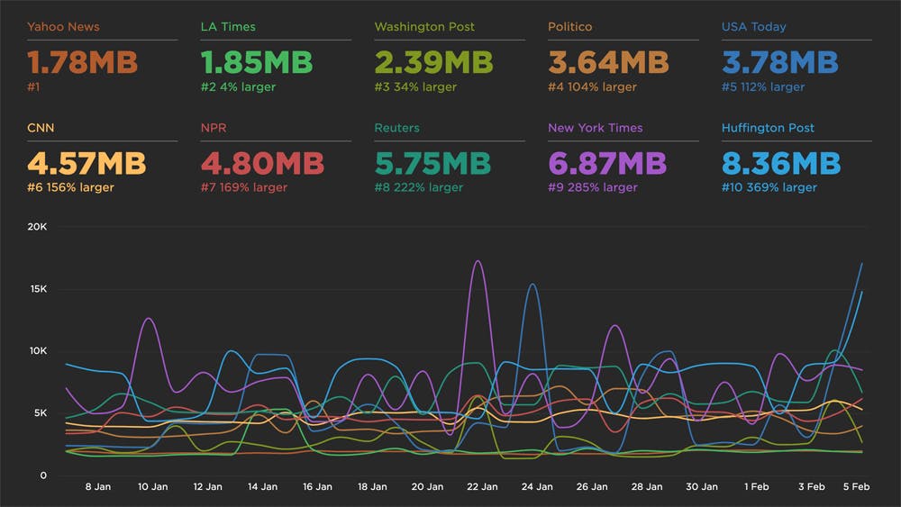 While a couple of pages fall below the HTTP Archive median size of 1900KB, the rest are larger – with two pages topping out in the 6-8MB range. (As someone who’s also obsessed with data usage – I spend a lot of time reading articles while I'm out roaming the world – this is a reminder that I need to be extra mindful of my news consumption when I’m out and about.)