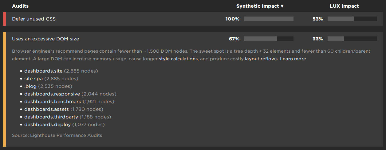 You can also order audits by their Synthetic Impact, which is calculated as the percentage of your SpeedCurve URLs that are affected by each audit. This enables you to quickly pick out the performance improvements that will affect the greatest number of your pages.