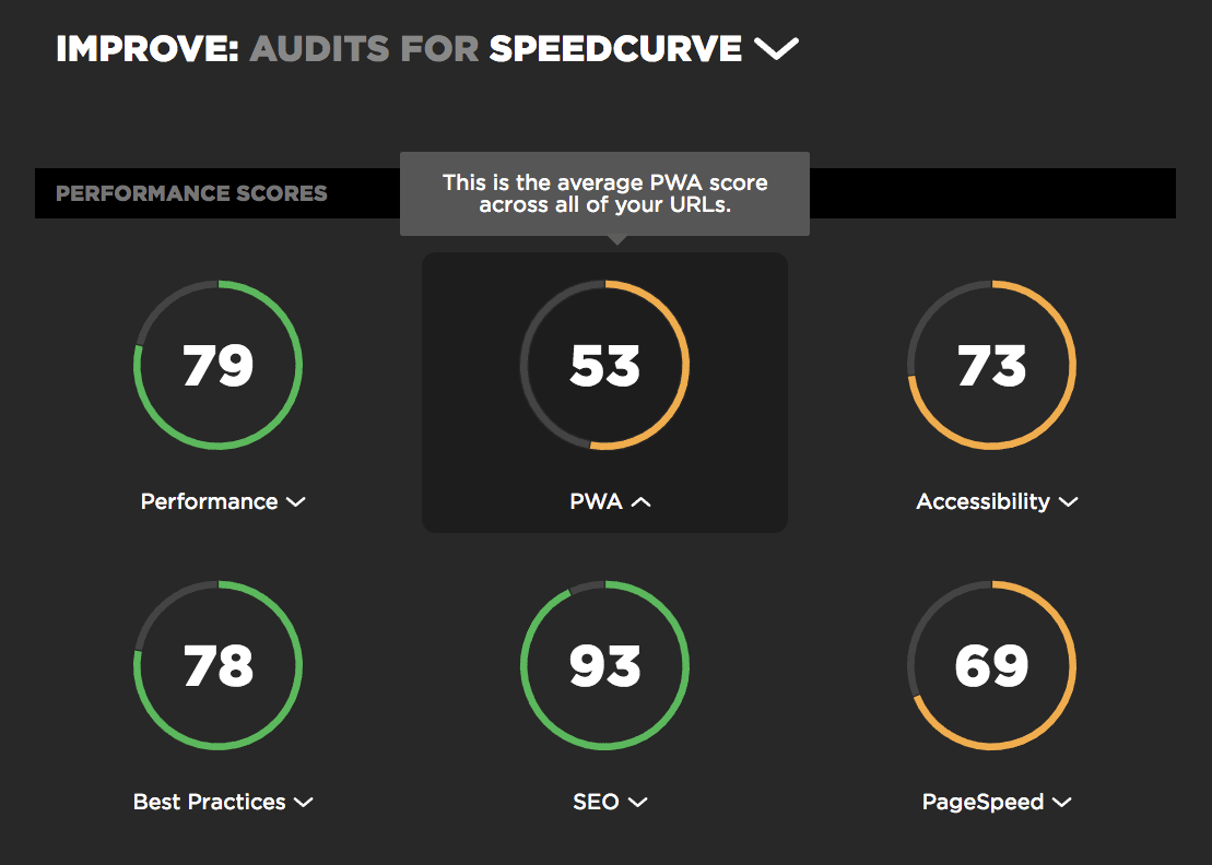 The Improve dashboard is available in the global left-hand navbar. The UI should look relatively familiar – it's the same UI that we use to display Lighthouse and PageSpeed scores on the test results page. Along the top you'll see the average scores across all of the URLs in your site.