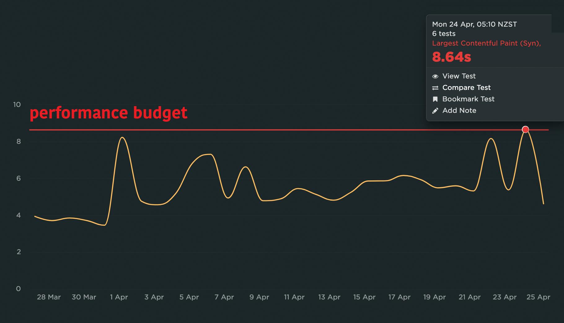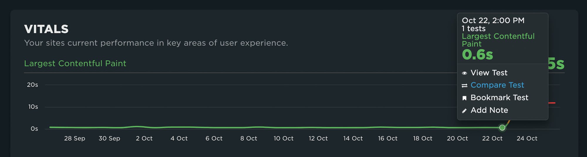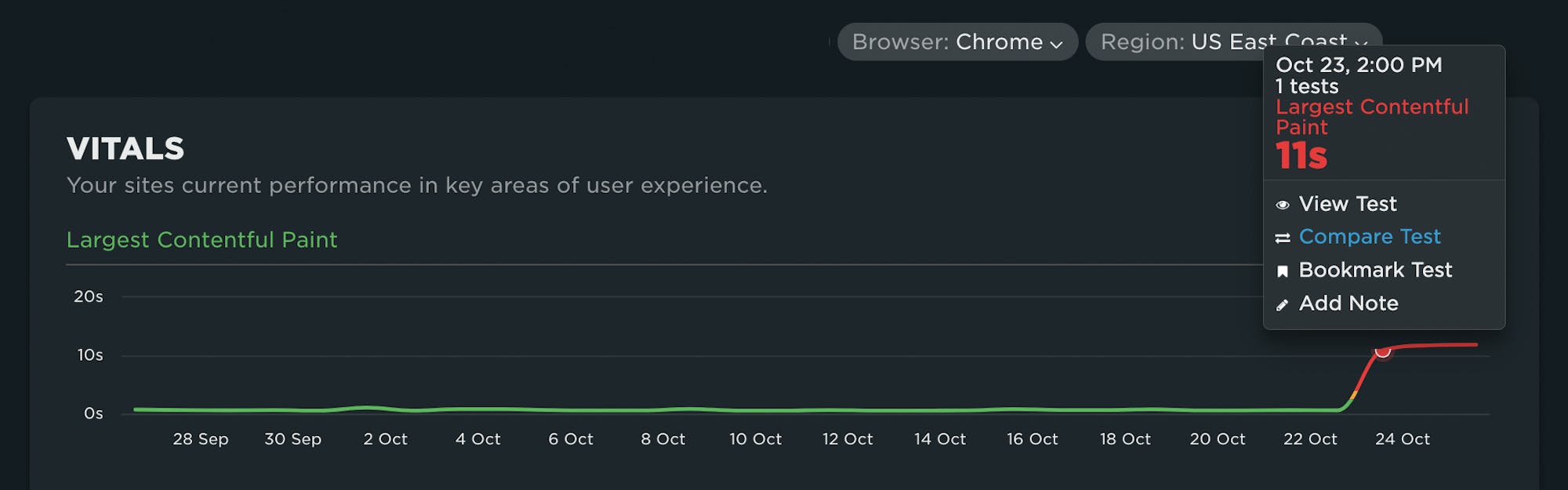 For example, if you see a spike in a metric, such as the LCP spike pictured below, you can click on that data point and select the 'Compare Test' option: