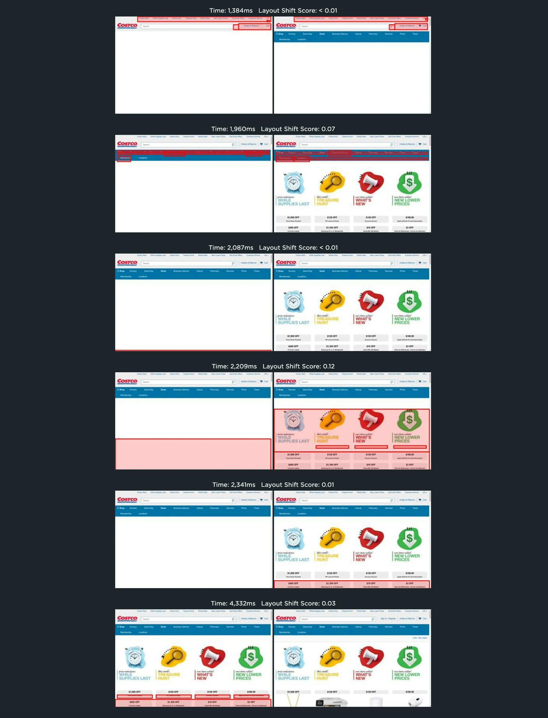 Cumulative Layout Shift is a notoriously tricky metric to understand. Visualizing all the shifting elements (within the red frames) on the page is extremely helpful. The more elements that shift – and the greater the movement – the more janky and unstable the page feels to your users.