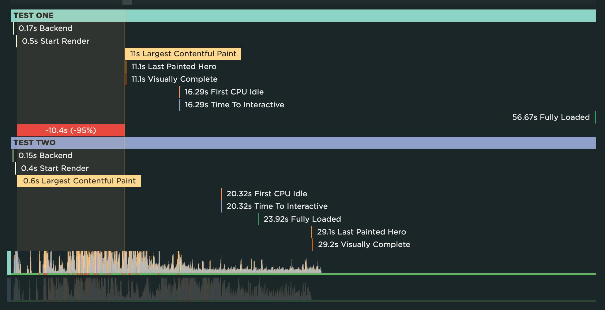 A huge benefit of tracking web performance over time is the ability to see trends and compare metrics. You can bookmark and compare different data points in your monitoring history, generating side-by-side comparisons that let you not only spot regressions, but easily identify what caused them: