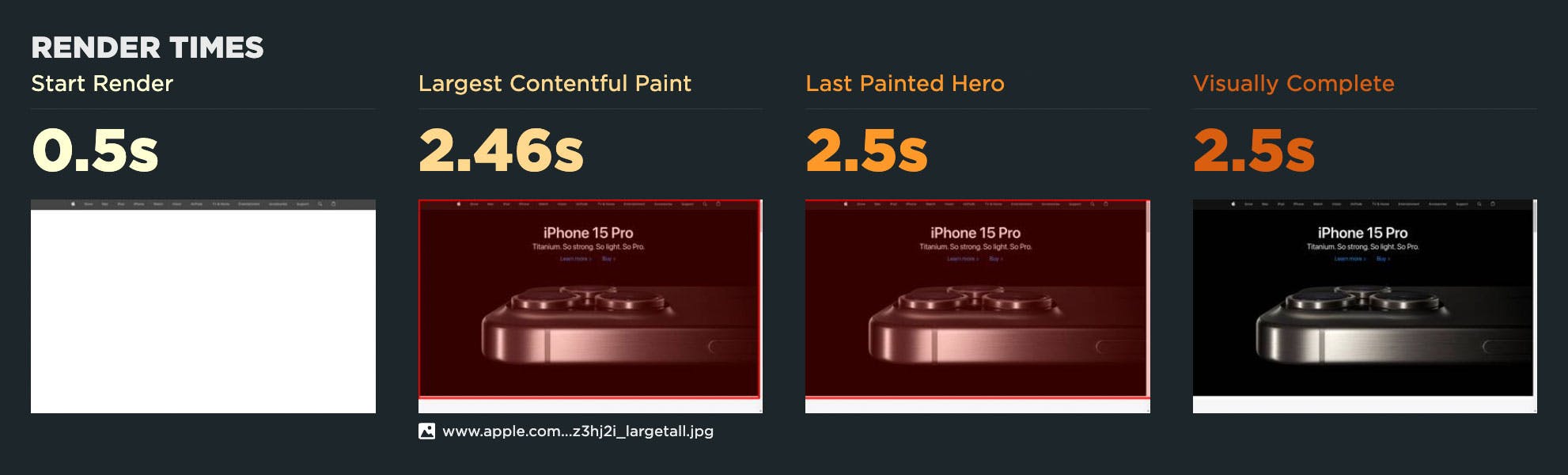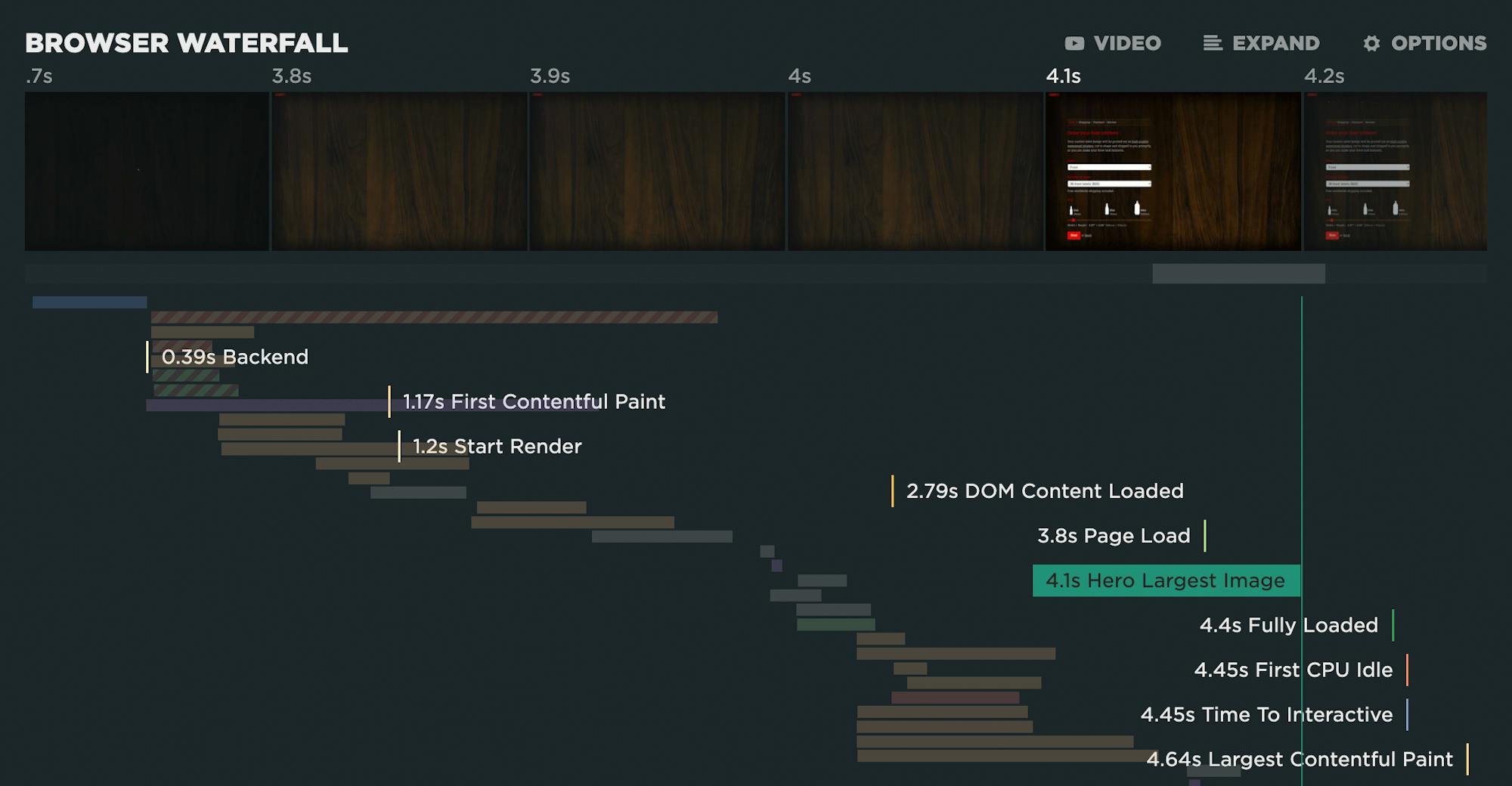 Your test details includes other helpful visuals, such as seeing the LCP element (framed in red) alongside other important rendering metrics, like Last Painted Hero and Visually Complete: