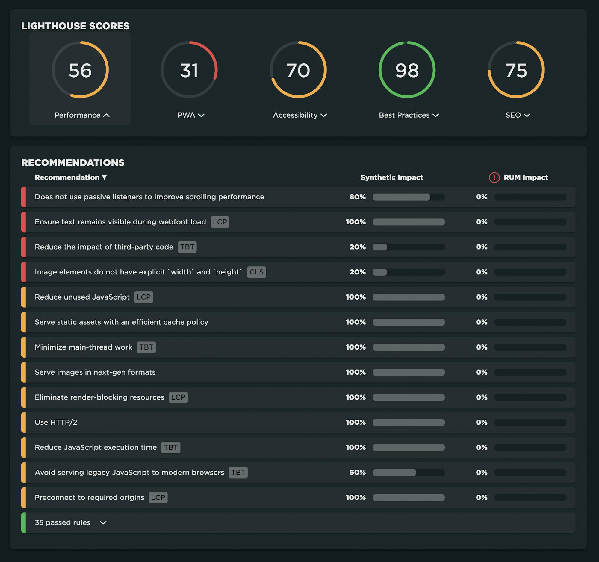 Your Improve dashboard is an incredibly helpful tool. Consider it your very own performance checklist, aggregating and prioritizing all your Lighthouse audits and performance recommendations across all the pages you're testing.