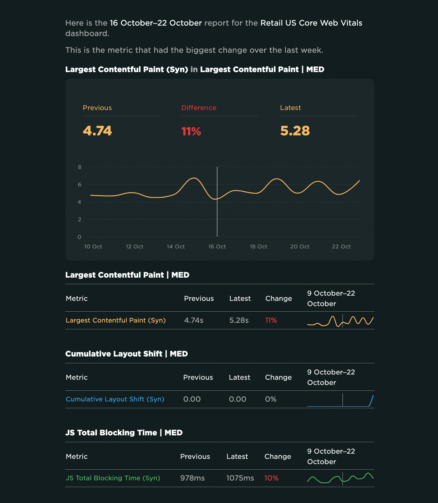 You can easily turn any custom dashboard into an automated weekly report that gets sent to a mailing list you create. Here's an example of a weekly report showing week-over-week changes to Core Web Vitals: