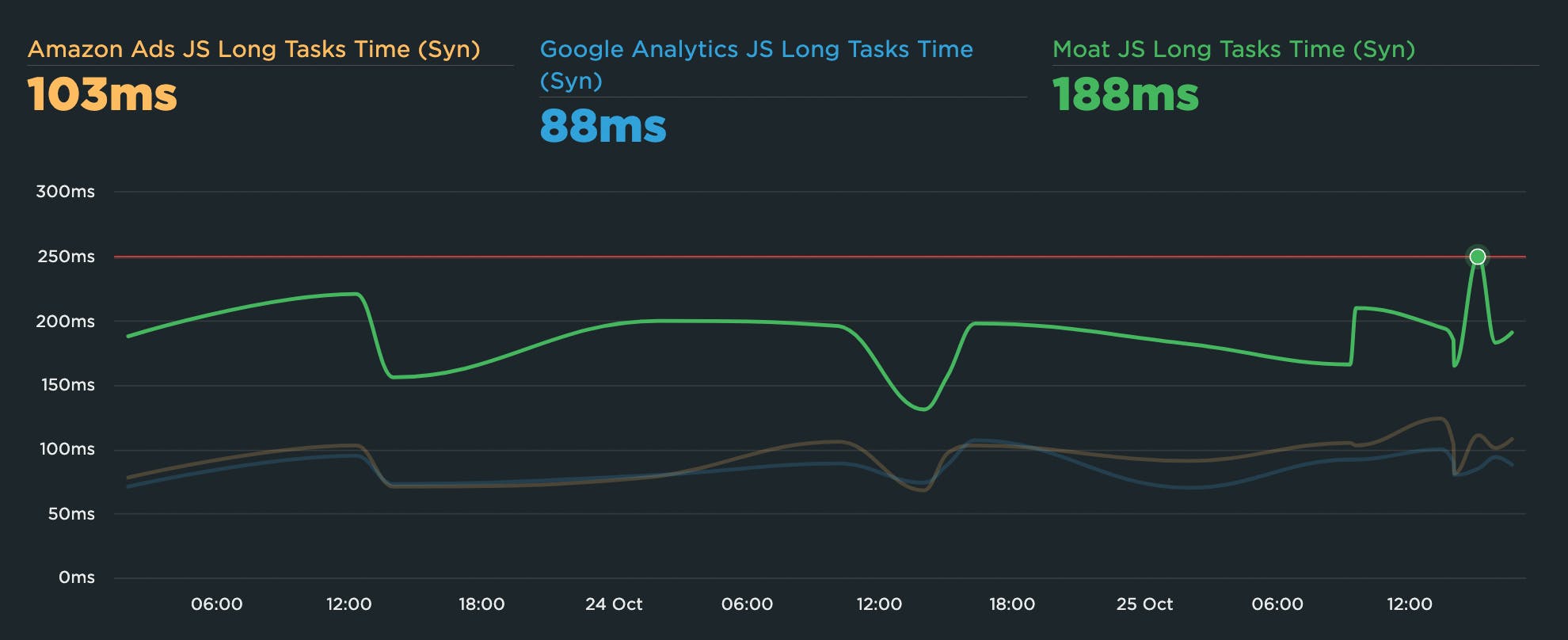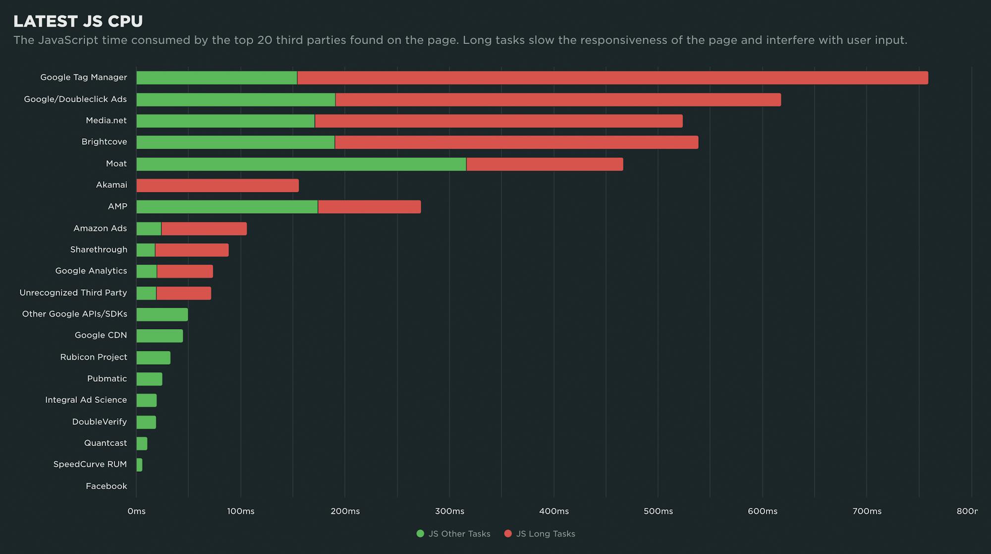 You can't fix what you don't measure. Your SpeedCurve Synthetic third-party dashboard lets you see at a glance how all your third parties are performing. Among (many) other things, you can see which of your scripts have excessive Long Task times (more than 50ms), which could be hurting the interactivity of your pages.