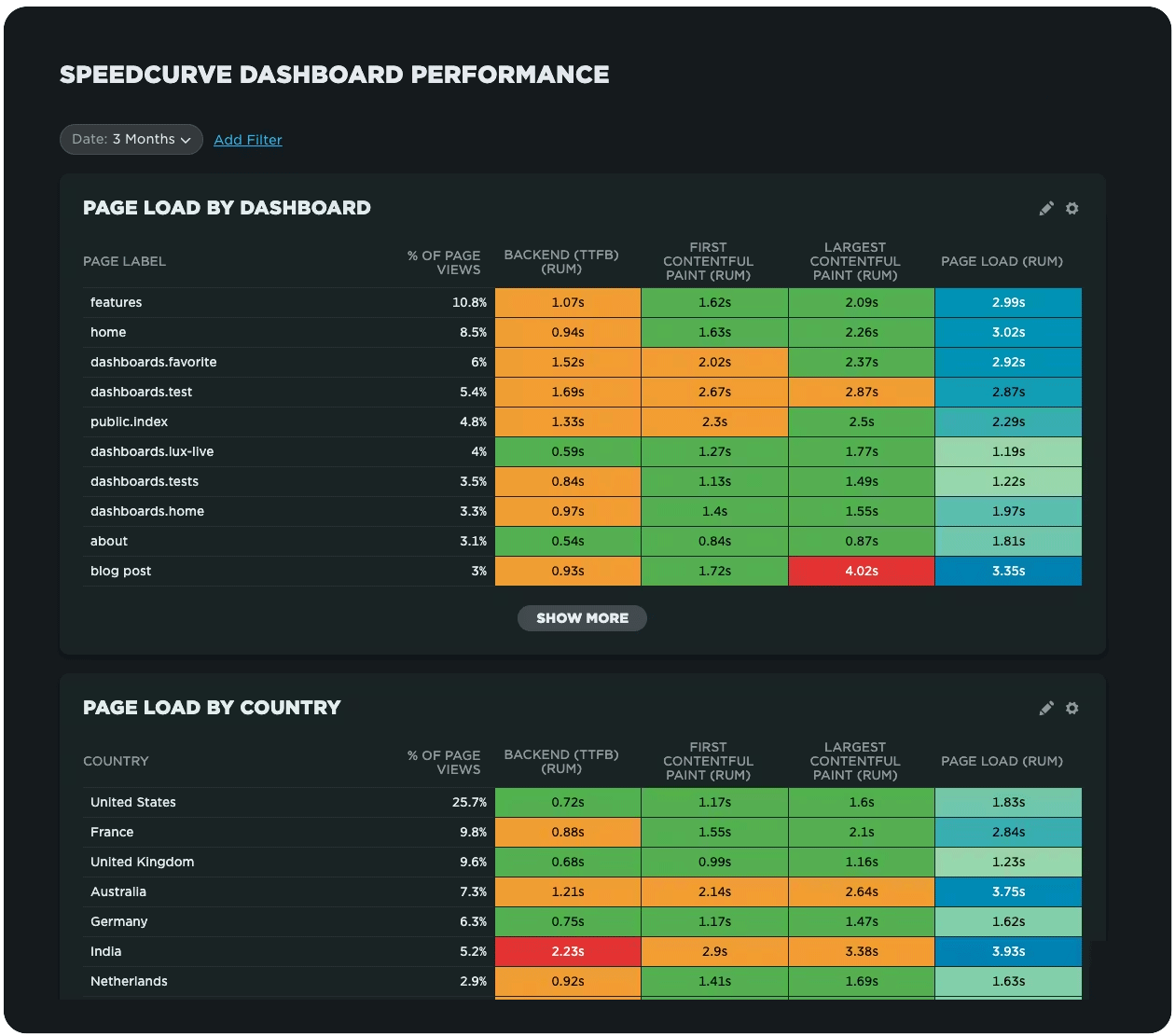 Heat maps are a powerful way to get an instant overview of where performance issues are hiding across your site. They let you break down your performance metrics (including custom metrics) by different dimensions — including page label, browser, location, and device type — so you can easily spot anomalies and patterns in your web performance data.