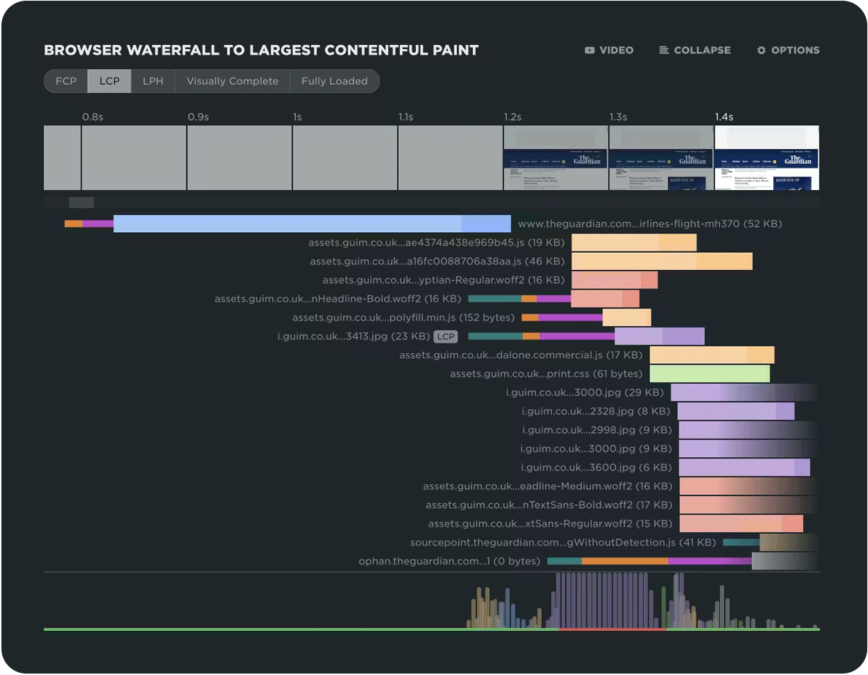 Waterfall charts are an essential tool in your diagnostics kit. They let you see at a glance the number of resources on a page, the size and type of each resource, when each resource is called, whether or not it's a blocking resource, how long it takes to render, plus a wealth of deeper metrics around CDN, caching, and more!