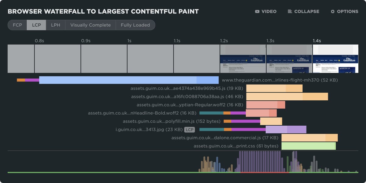 Waterfall charts are an essential tool in your diagnostics kit. They let you see at a glance the number of resources on a page, the size and type of each resource, when each resource is called, whether or not it's a blocking resource, how long it takes to render, plus a wealth of deeper metrics around CDN, caching, and more!