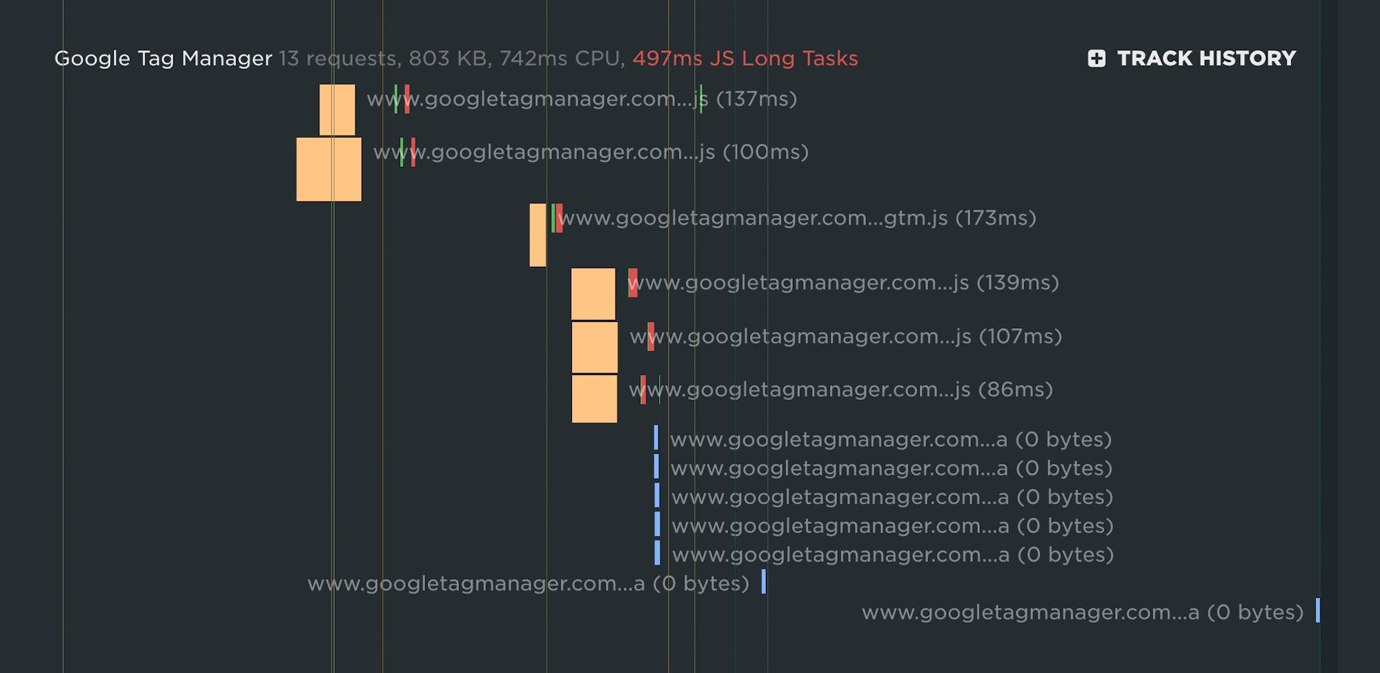 - Some third parties, such as Google Tag Manager, incur a significant performance penalty. As you can see below, GTM calls 13 resources and has a total Long Tasks time of 497 milliseconds. (Any task greater than 50s is a cause for concern.) Excessive Long Tasks don't just mean slower rendering times. They also mean that the page can feel unstable as users interact with it.