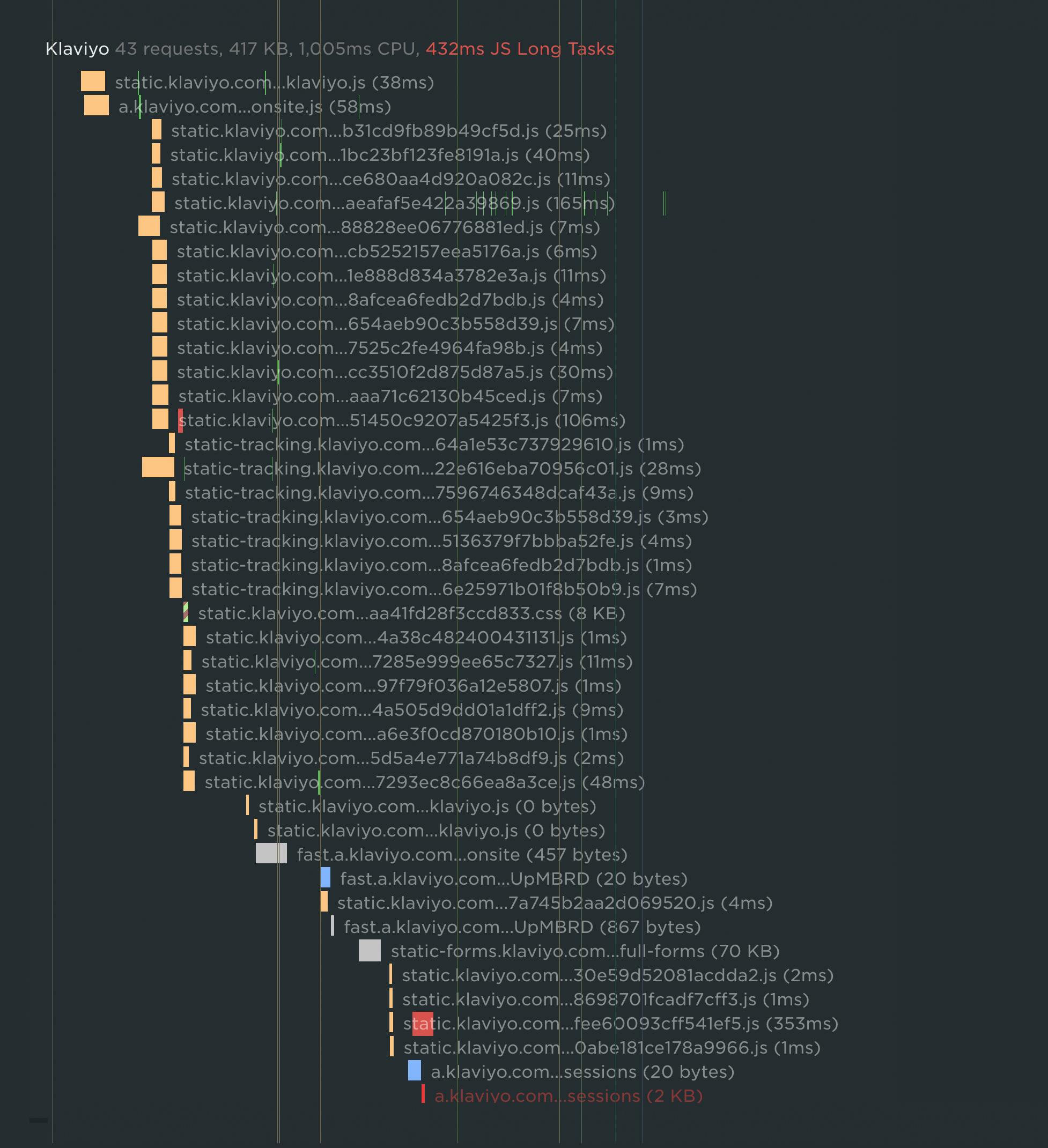 - Klaviyo — 43 requests, and a total Long Tasks time of 432ms (see below)