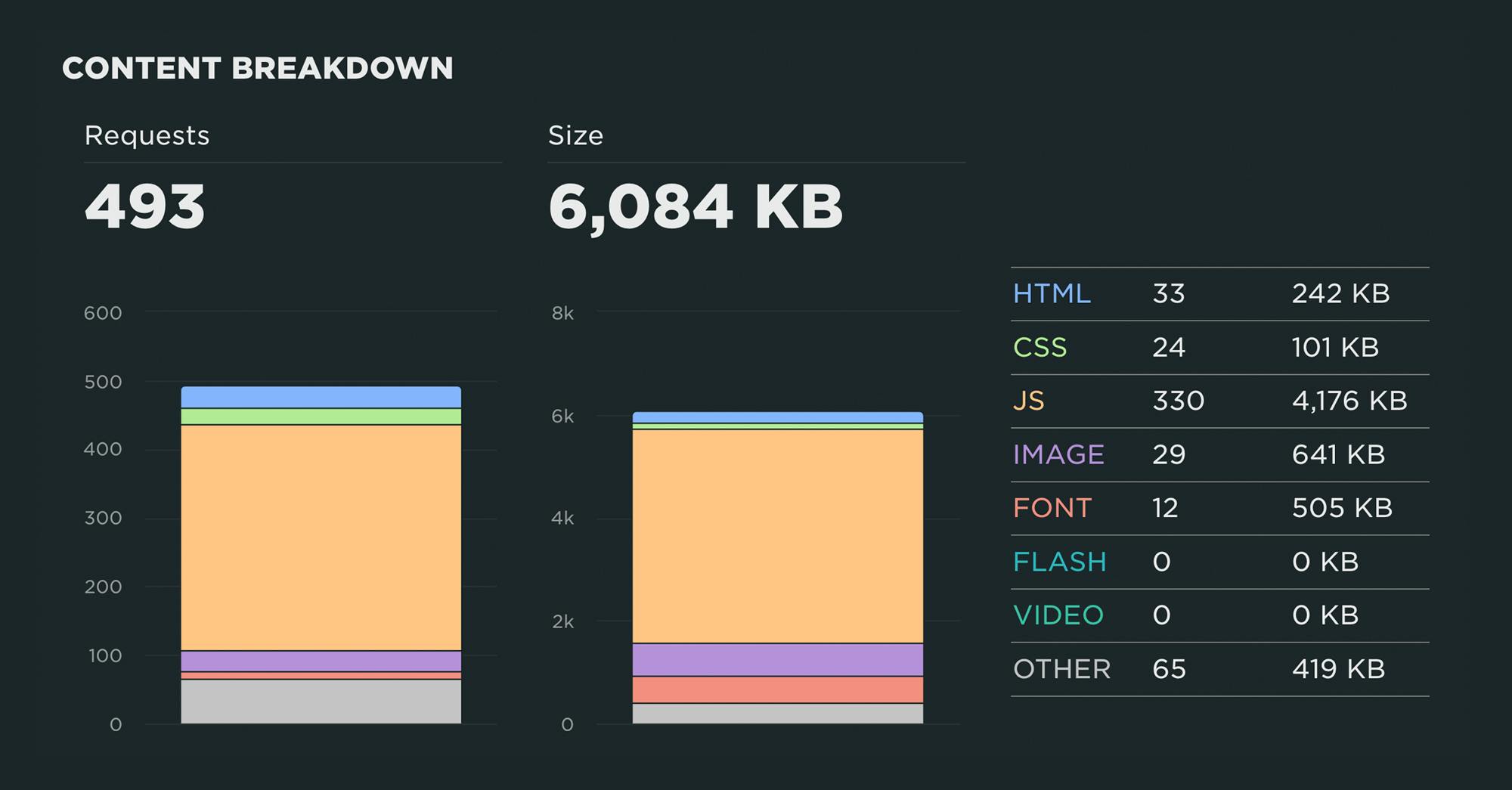 Looking at the composition of this page, we see that it's fairly large, at around 6MB. More notably, this page contains a very large number of requests — 493 in total, with 330 of those requests in the form of JavaScript.