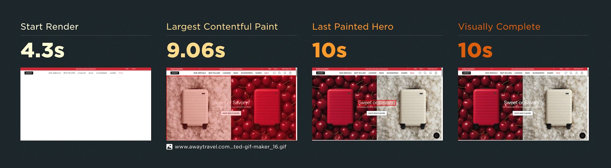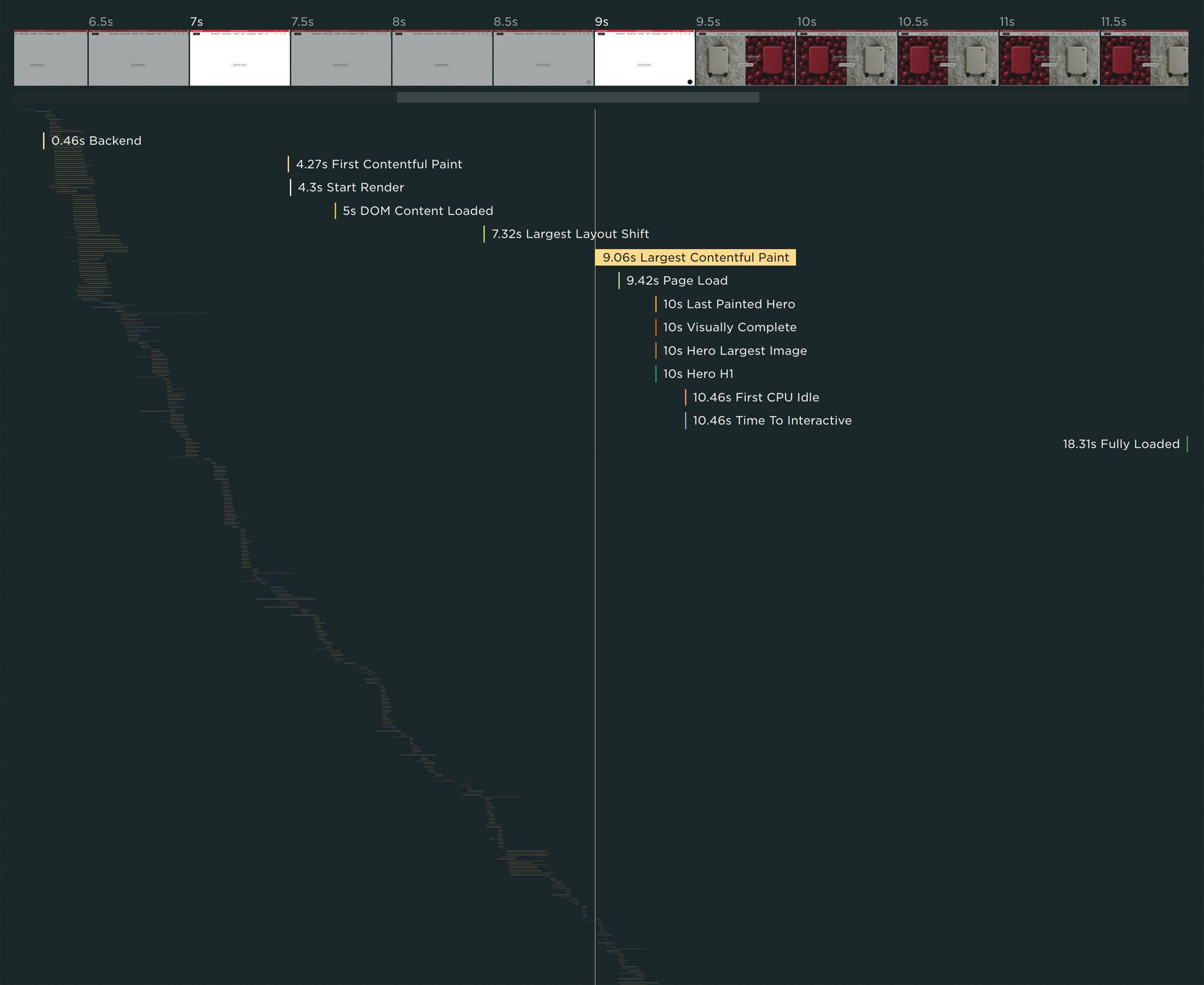 Here is a high-level waterfall for the Away campaign page. It shows how key metrics align with the rendering timeline (the filmstrip view at the top of the chart).