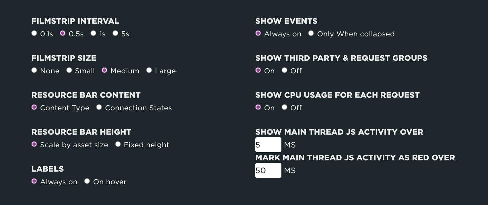 To investigate the performance of third-party JavaScript, we can take advantage of a nifty feature in SpeedCurve (available under 'Options' in the top right corner of the waterfall), which lets you learn which requests have high CPU usage, as well as excessive main thread activity.