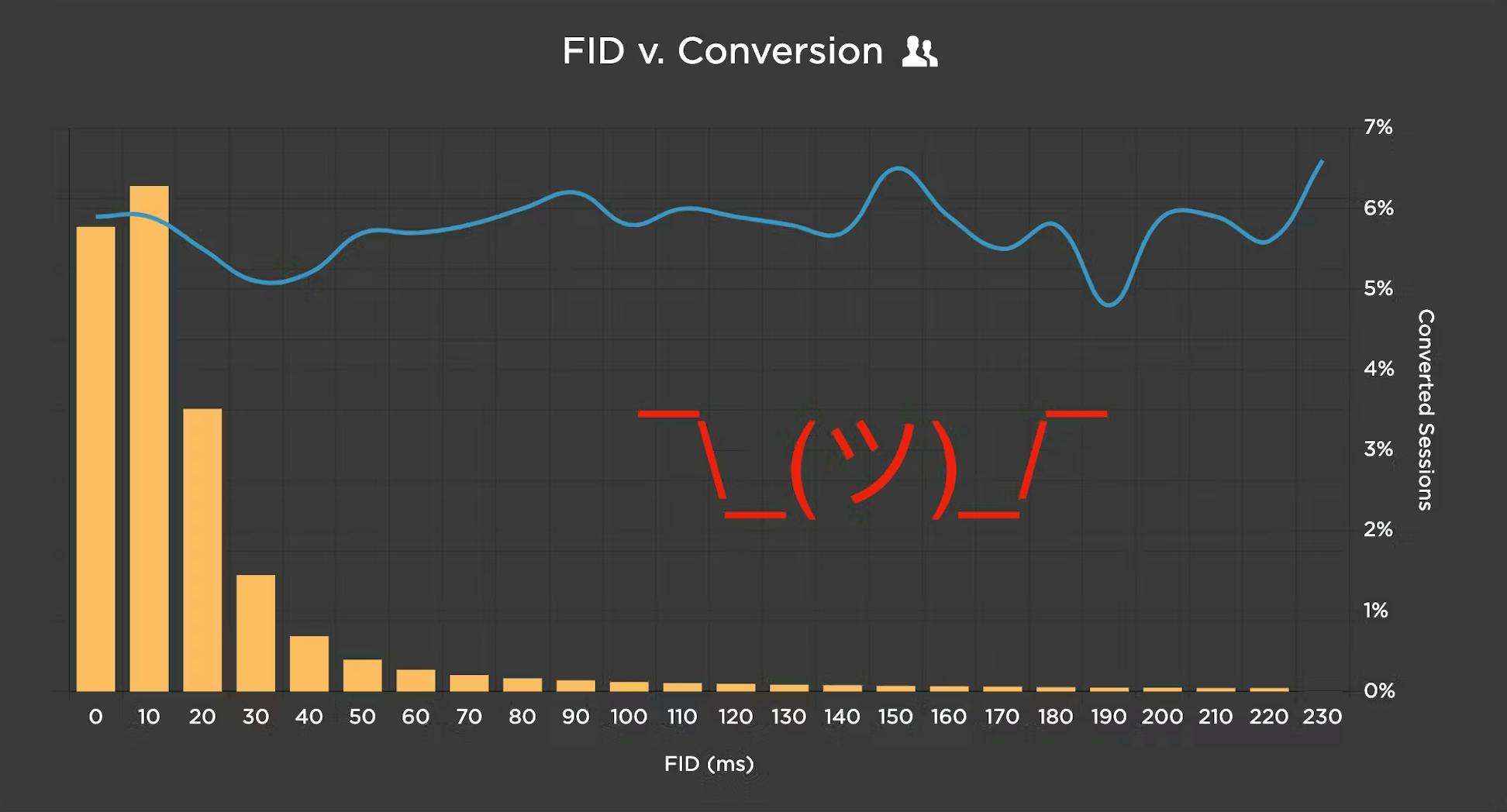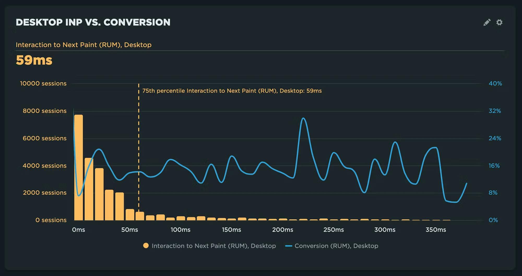 The point of measuring responsiveness is because unresponsiveness hurts the user experience – which ultimately hurts your business metrics, such as bounce rate and conversions. If this is true, then we should be able to draw a direct line between Interaction to Next Paint and business metrics.