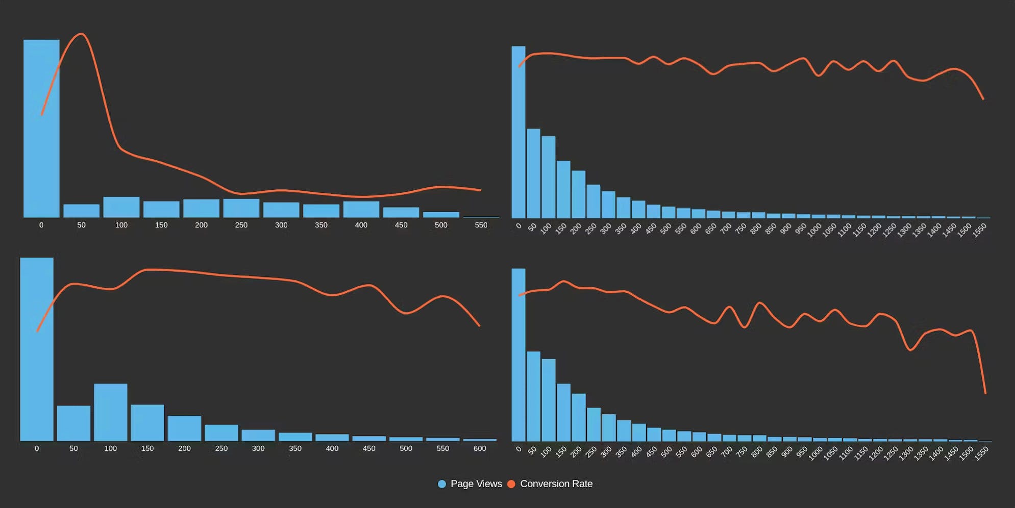 Correlation charts give you a histogram view of all your user traffic, broken out into cohorts based on performance metrics such as INP. The chart also includes an overlay that shows you a user engagement metric or business metric – such as bounce rate or conversion rate – that correlates to each of these cohorts. This lets you see at a glance the relationship between performance, user engagement, and your business.