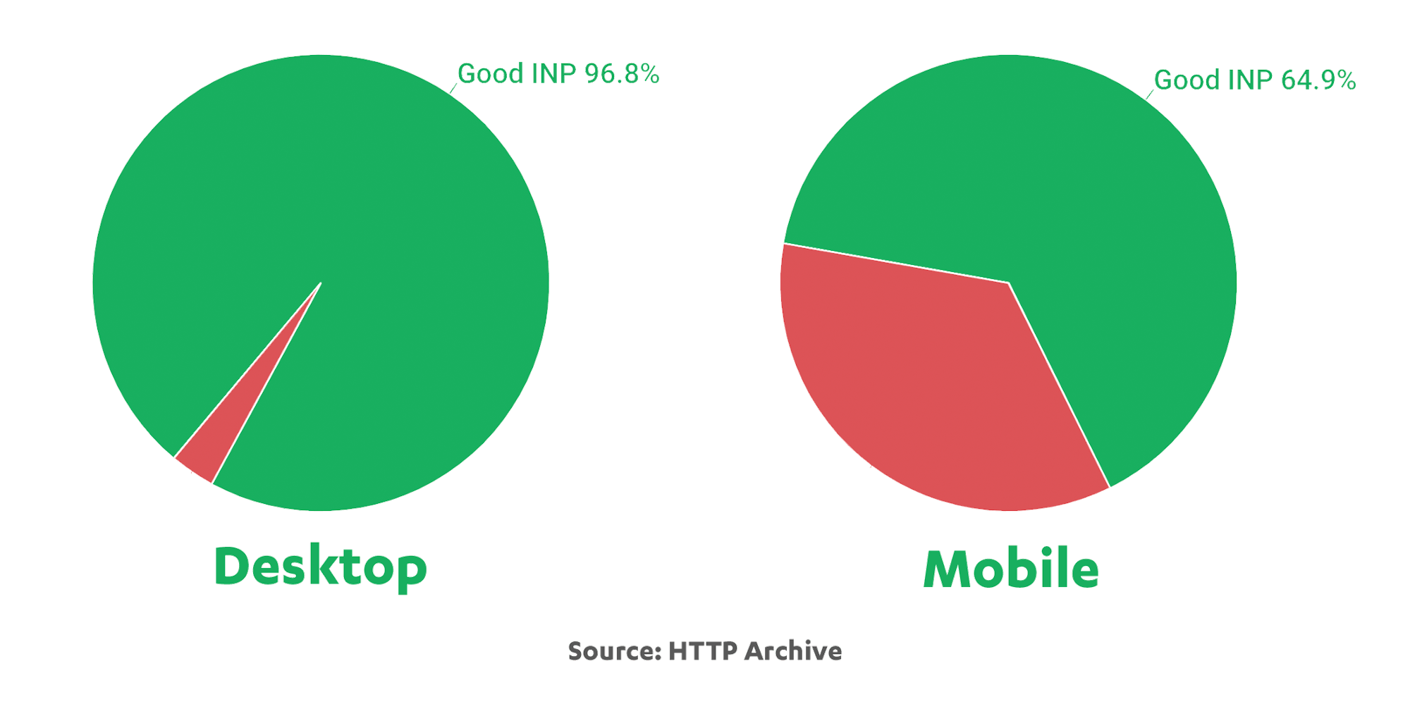 Looking at data from the HTTP Archive, which tracks performance metrics for the top million sites on the web, the percentage of sites that have good INP is 96.8% for desktop, but only 64.9% for mobile. One of the biggest culprits: latency, which is typically worse on mobile.
