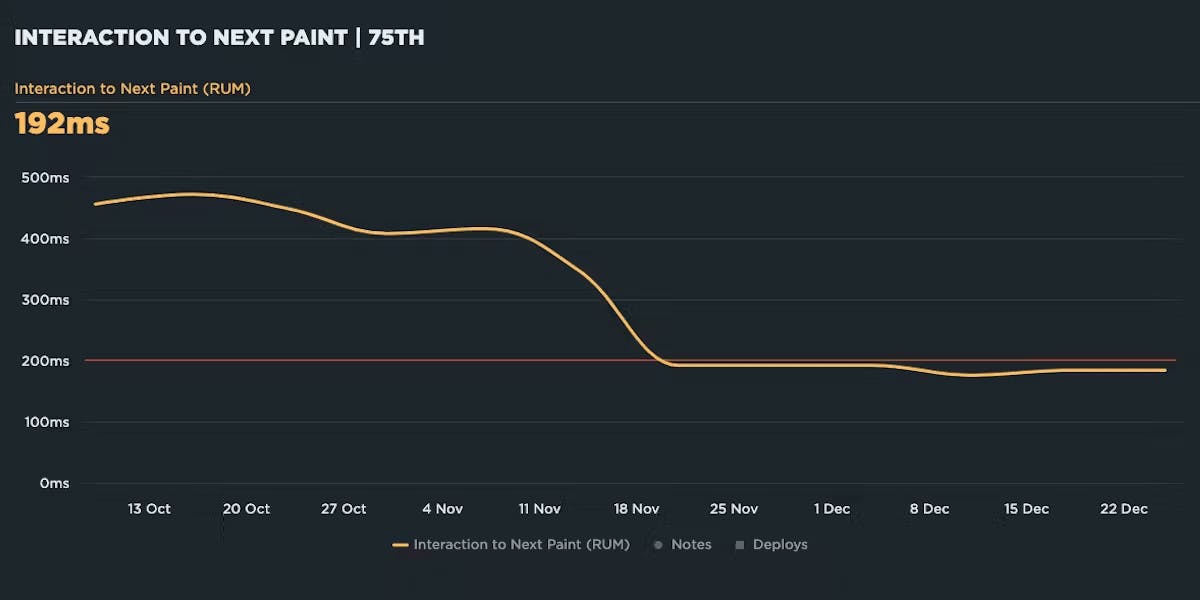 According to Google, an INP of 200 milliseconds or less is ideal. Having said that, you may wish to aim for a faster INP for your own pages, for reasons I'll go into further down in this post.