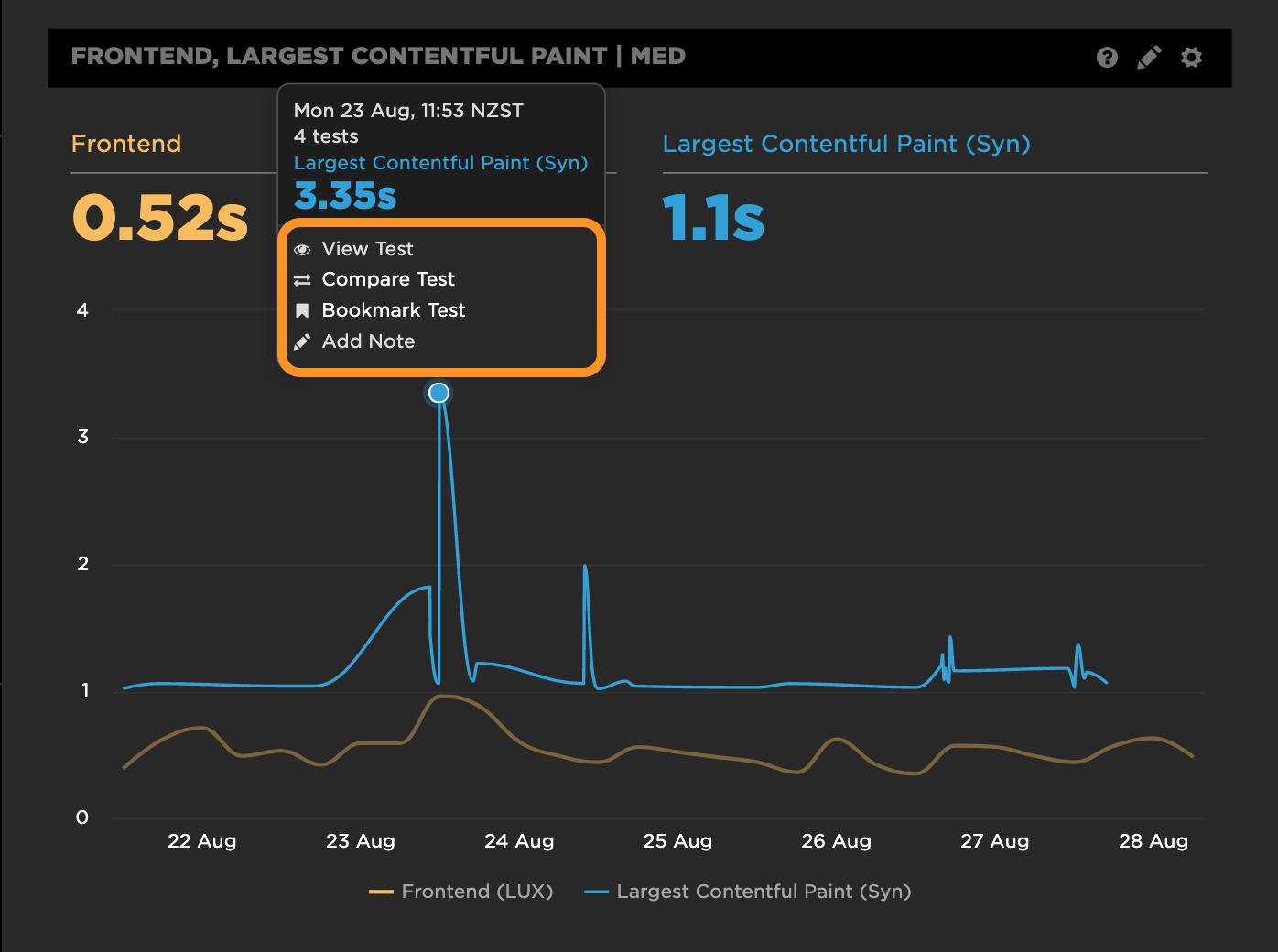 To get started, hover over data point in any time series chart and click. Within the popup, you can click "View Test" to see the full median test result for that test run. Or, if you already know that you want to bookmark that test for comparison, you can simply hit "Bookmark Test" within the popup.