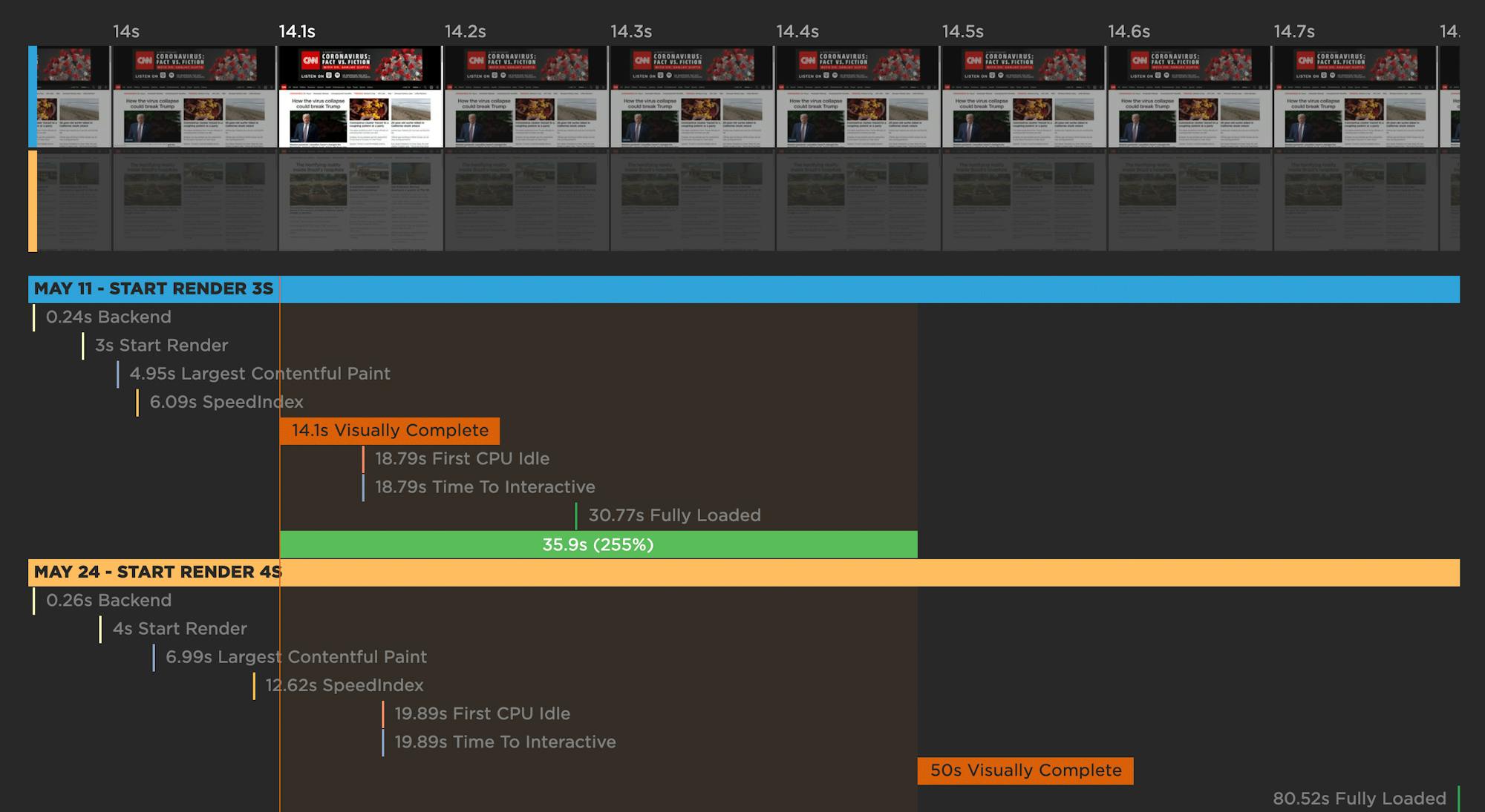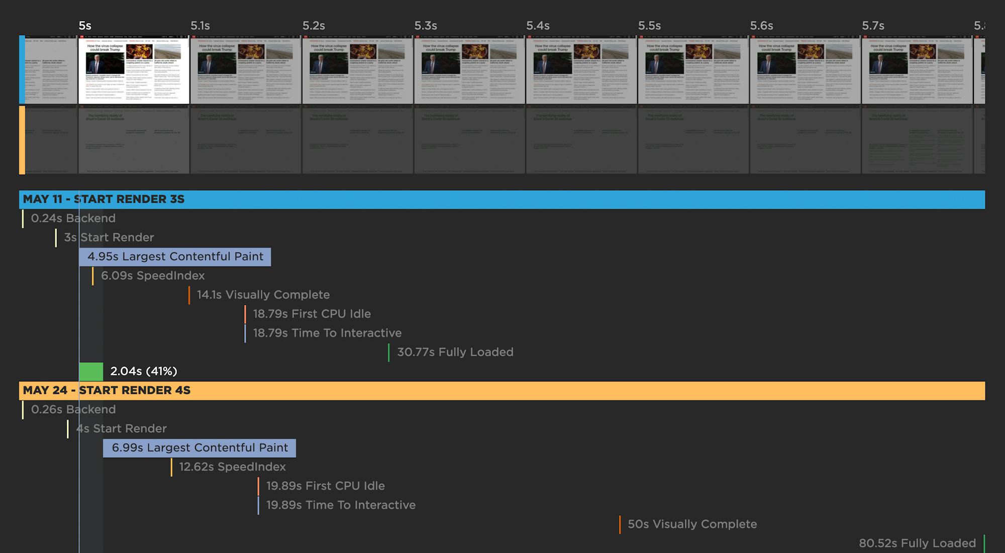 For this particular page, it looks like Largest Contentful Paint is a more meaningful metric, in terms of tracking when important content has rendered, so let's look at that. Things look a bit better in the May 11 test when Largest Contentful Paint fires at 4.95 seconds. In the May 24 test, LCP lags at almost 7 seconds.