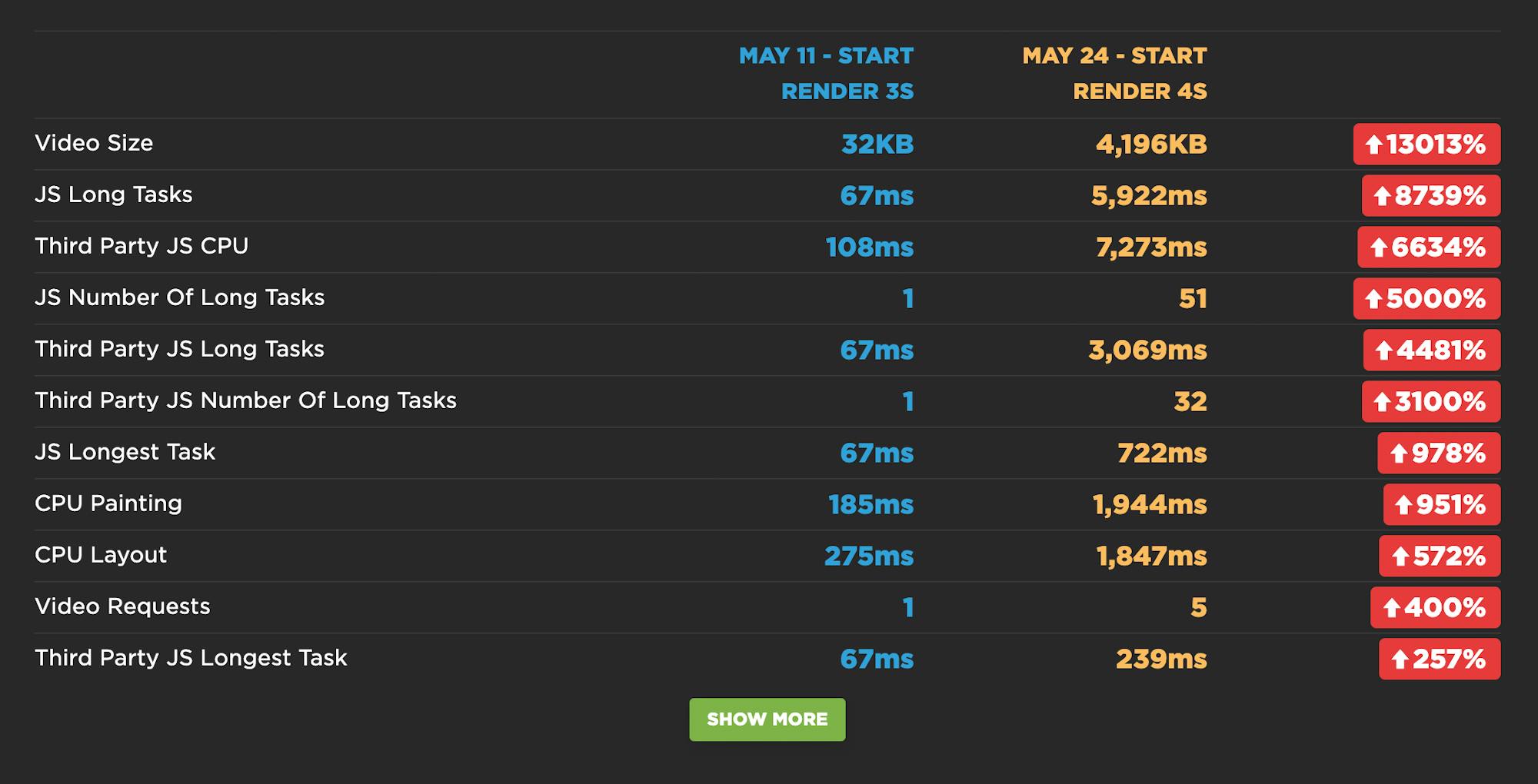 - Video size has jumped from 32KB to more than 4MB. This would help explain the extremely delayed Visually Complete and Fully Loaded times.