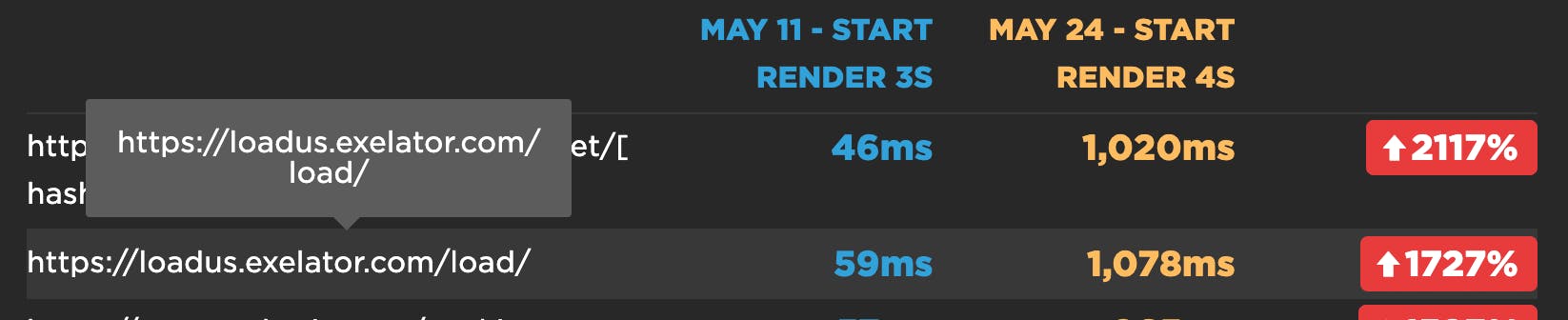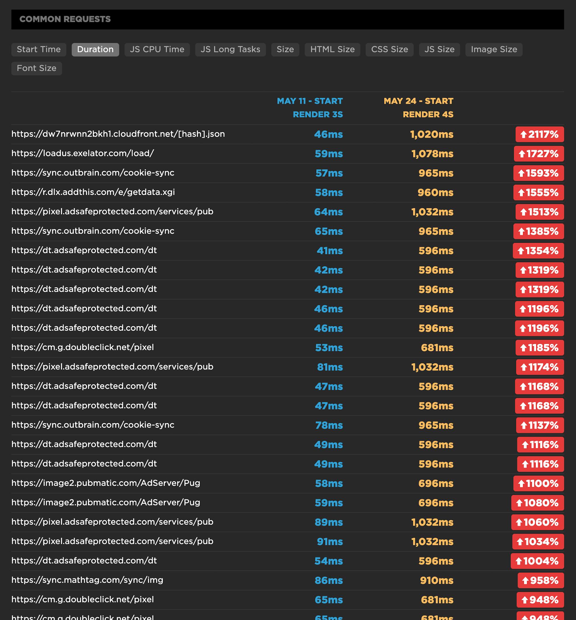 Now that we know that the number and complexity of JS requests is a major issue, we can find out exactly which scripts appear to be the culprits. This is a list of all the common requests that are shared across both pages, along with a calculation of how much performance degradation each request experienced:
