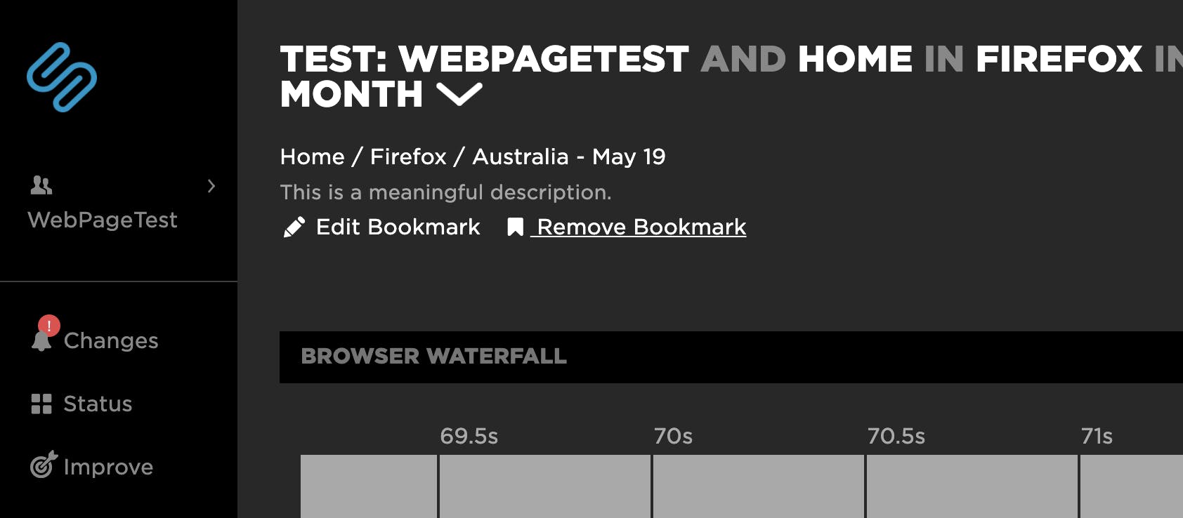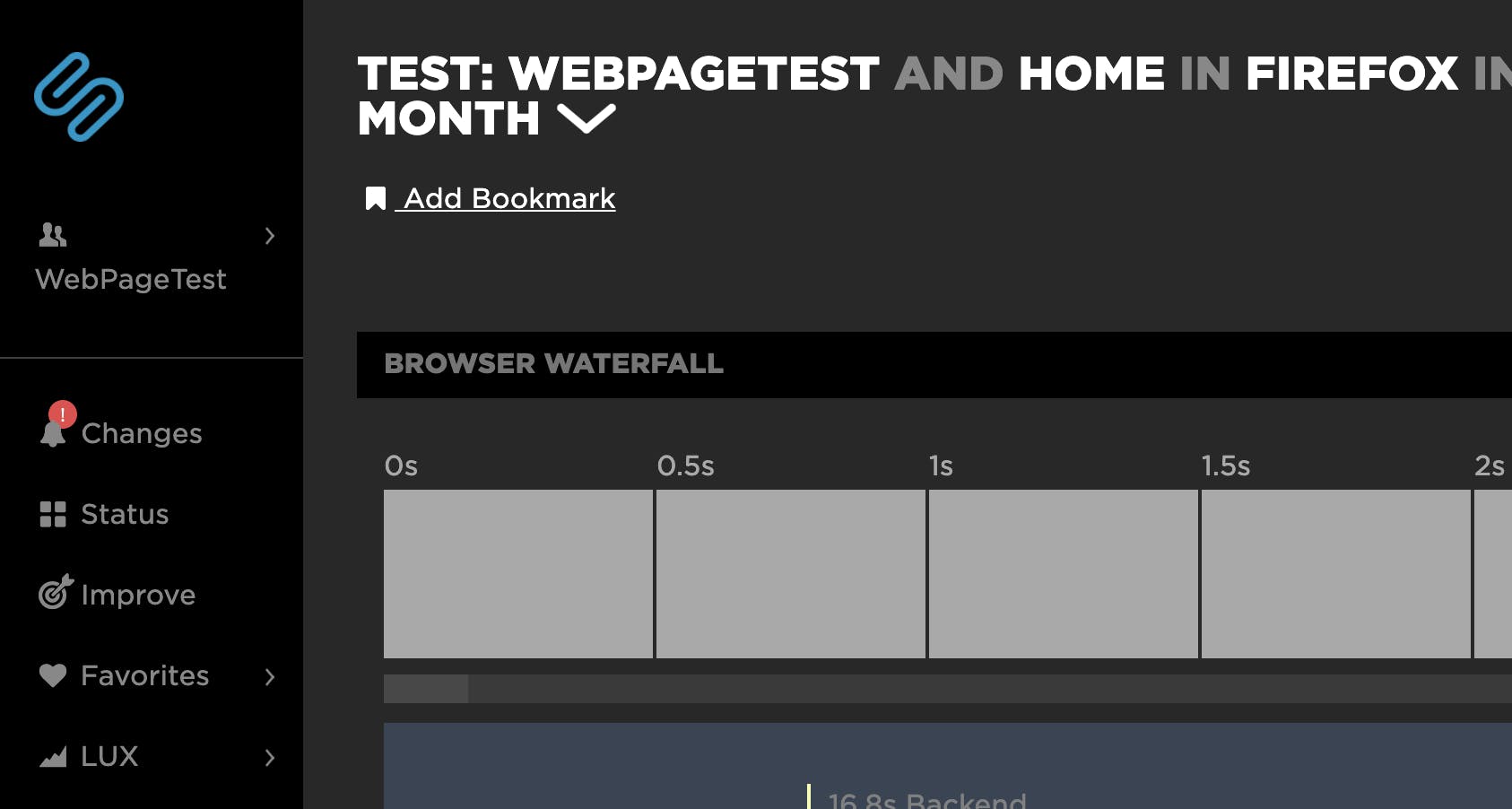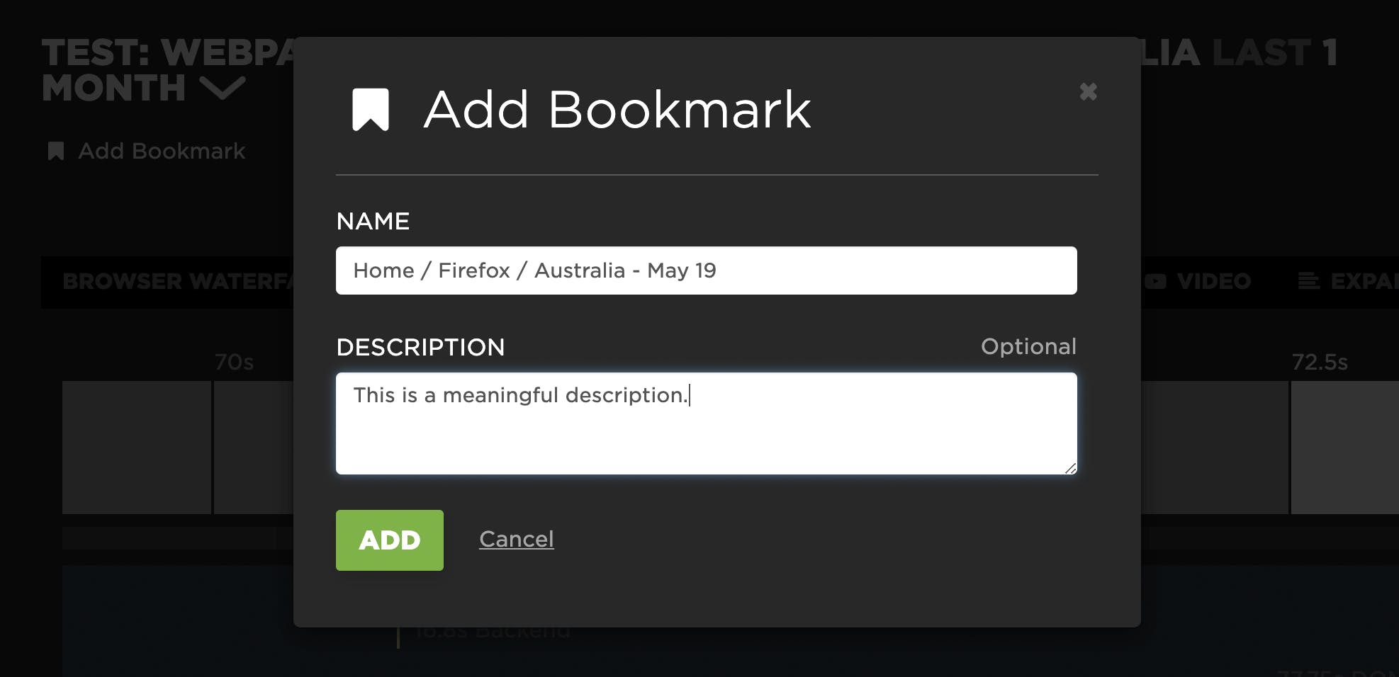 If you've drilled down into a Synthetic test result and confirmed that you want to bookmark it for comparison, all you need to do is click the "Add Bookmark" link in the top-left corner of the window.