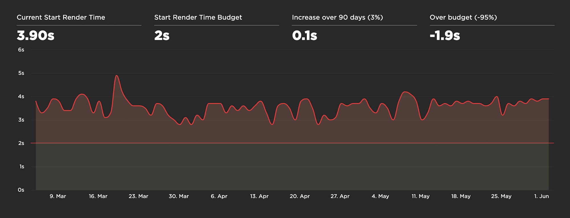 Looking at the last three month's worth of Synthetic test data, we can see that the CNN home page has a Start Render time that's consistently above the 2-second threshold that we usually recommend – and that Start Render has sometimes hit almost 5 seconds.