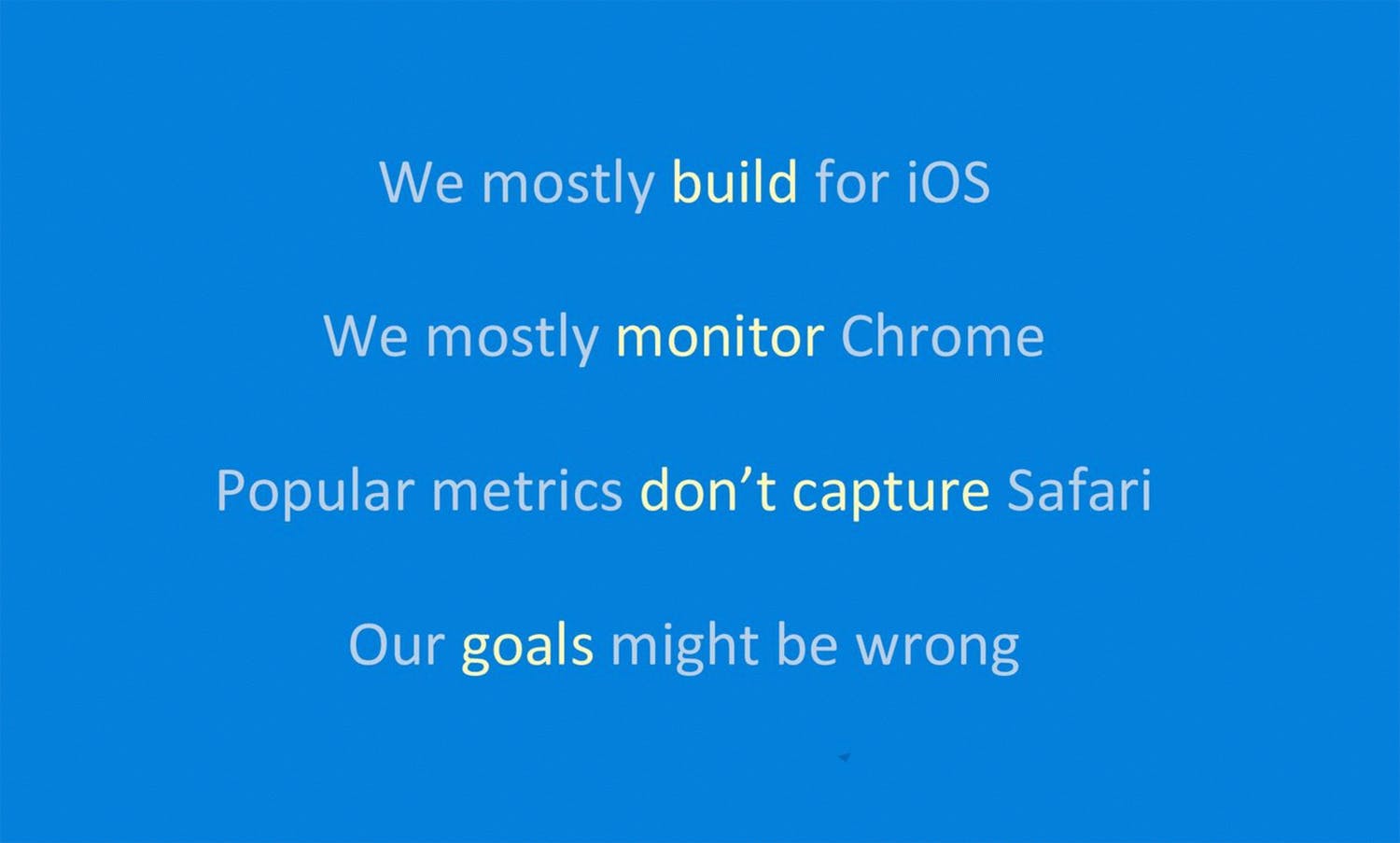The premise of Alex's talk continued with the theme that we need to do more if we want to save the web, especially on mobile. As a platform, mobile is getting killed by native apps. The inability to measure performance consistently across browsers perpetuates this issue.