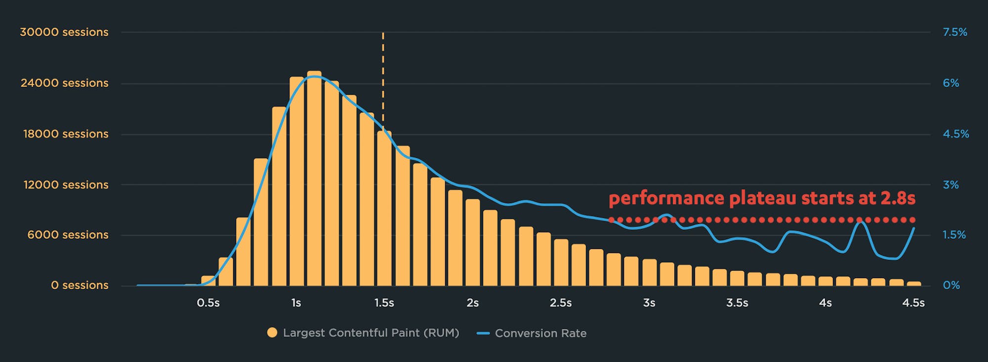 The performance plateau is the point at which changes to your website’s rendering metrics (such as Start Render and Largest Contentful Paint) cease to matter, because you’ve bottomed out in terms of business and user engagement metrics.