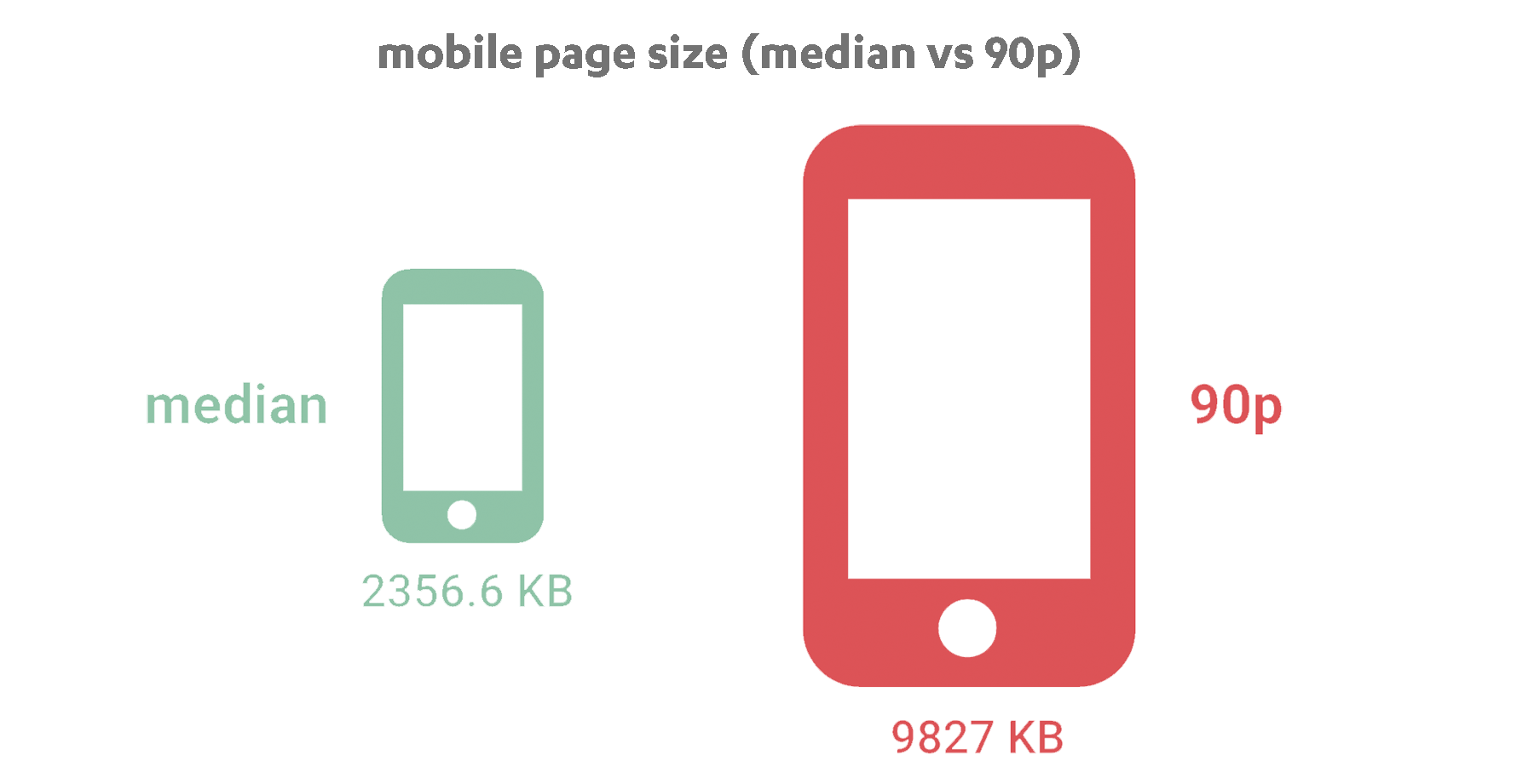 The 90th percentile page served to mobile is almost 10 MB, making it four times larger than the median page. As before, consider the range of mobile devices that might be struggling to render this massive page.