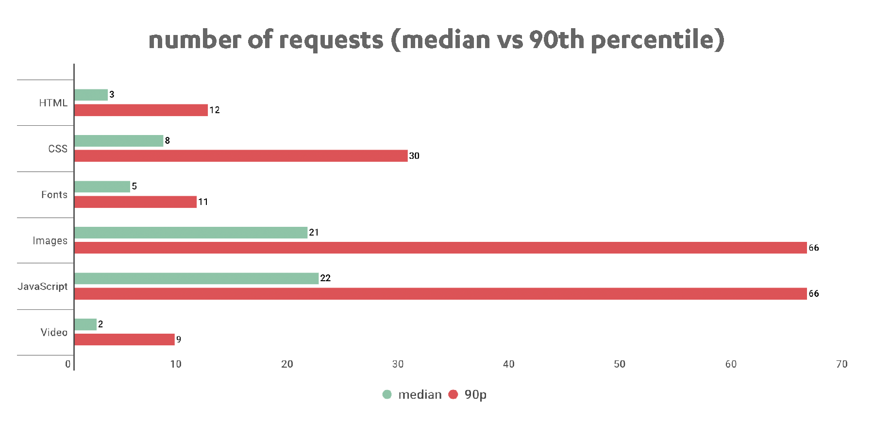 While it wasn't surprising to see the large number of image, JavaScript, and video requests at the 90th percentile, it was a surprise to see that the 90p page contained 12 HTML requests and 30 CSS requests.