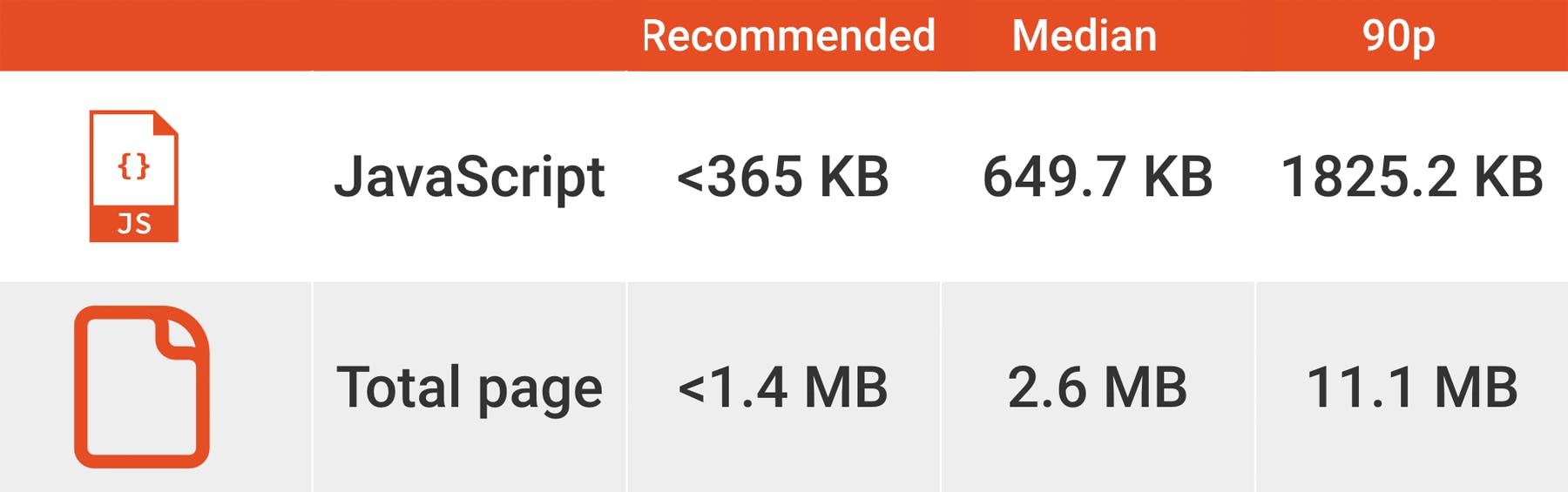- For JS-centric pages – No more than 365 KB of JS and 365 KB of markup, for a total of 730 KB