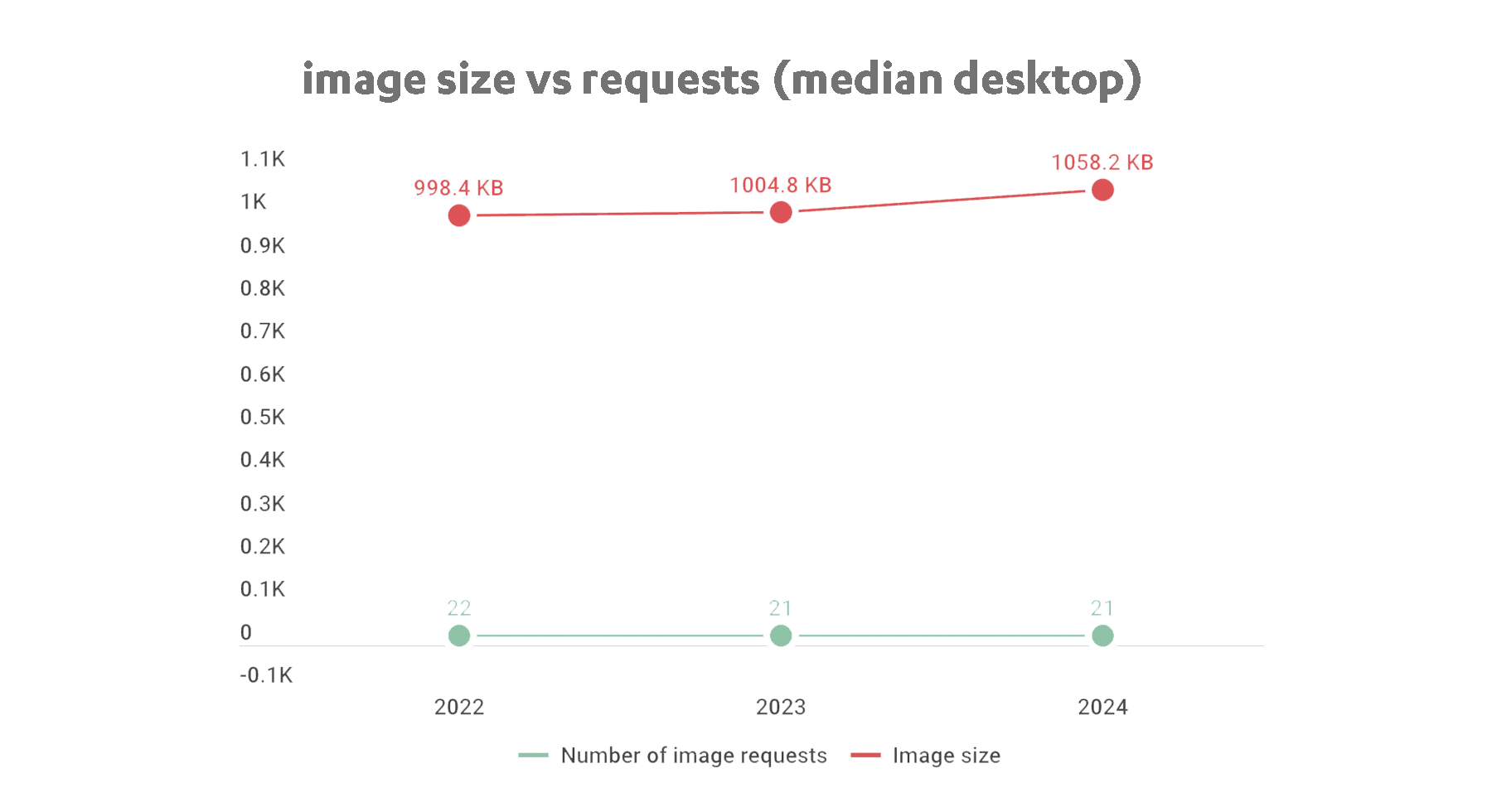 Similar to the observation about JS size and resources above, it's interesting to see that while the number of image requests has been more or less stable over the past couple of years, the total size has increased. This suggests that the size of individual images is trending upward.