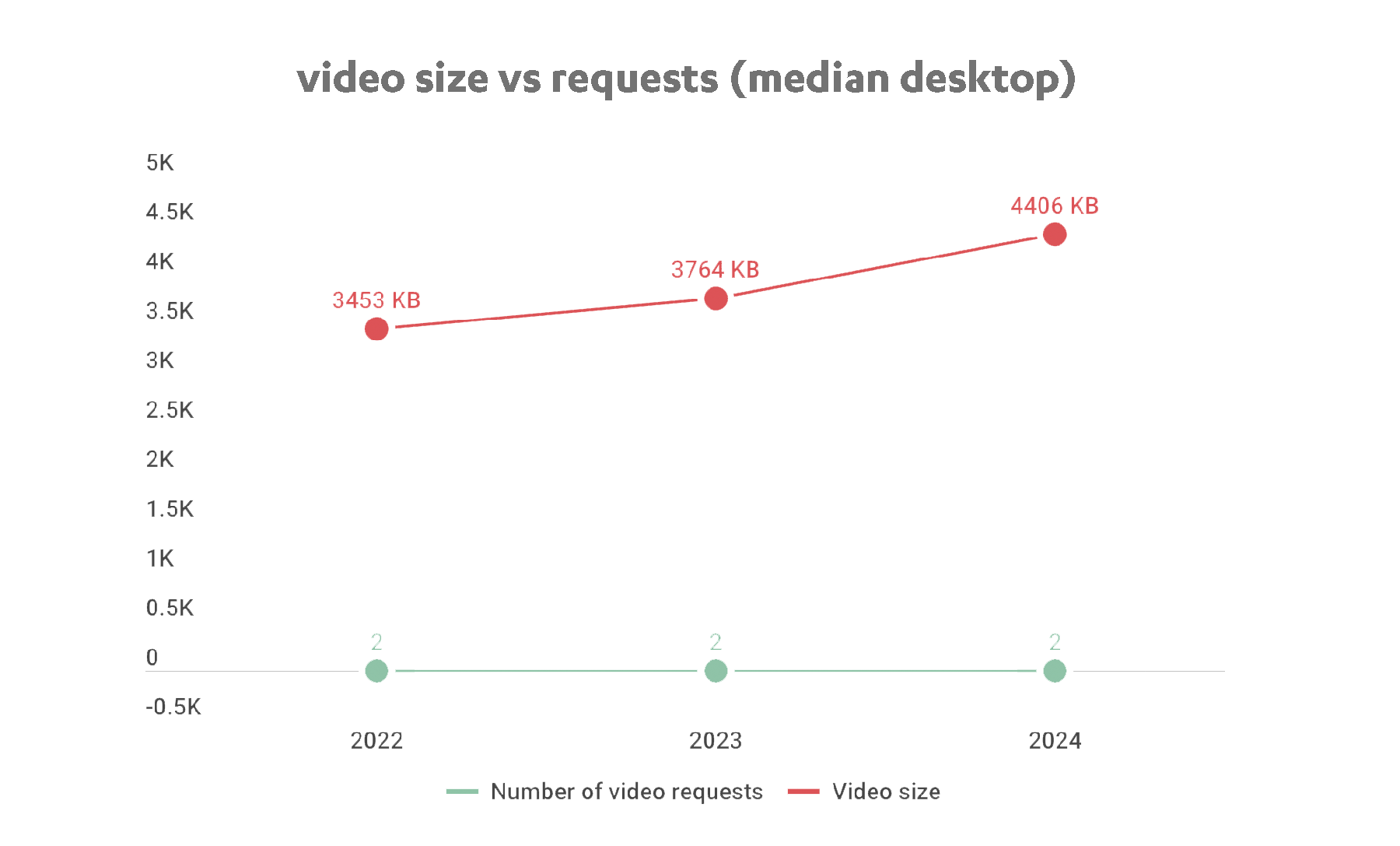While not all pages serve video, those that do are serving larger and larger video files. The median page that contains video serves just 2 files, but the total weight has increased by 28% in just two years.