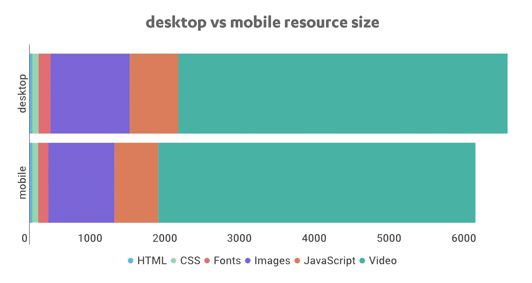 While the median mobile page is still a bit smaller than the desktop page, when we look at the breakdown across resource types, we can see growth in images, JavaScript, and video, just as we did with desktop: