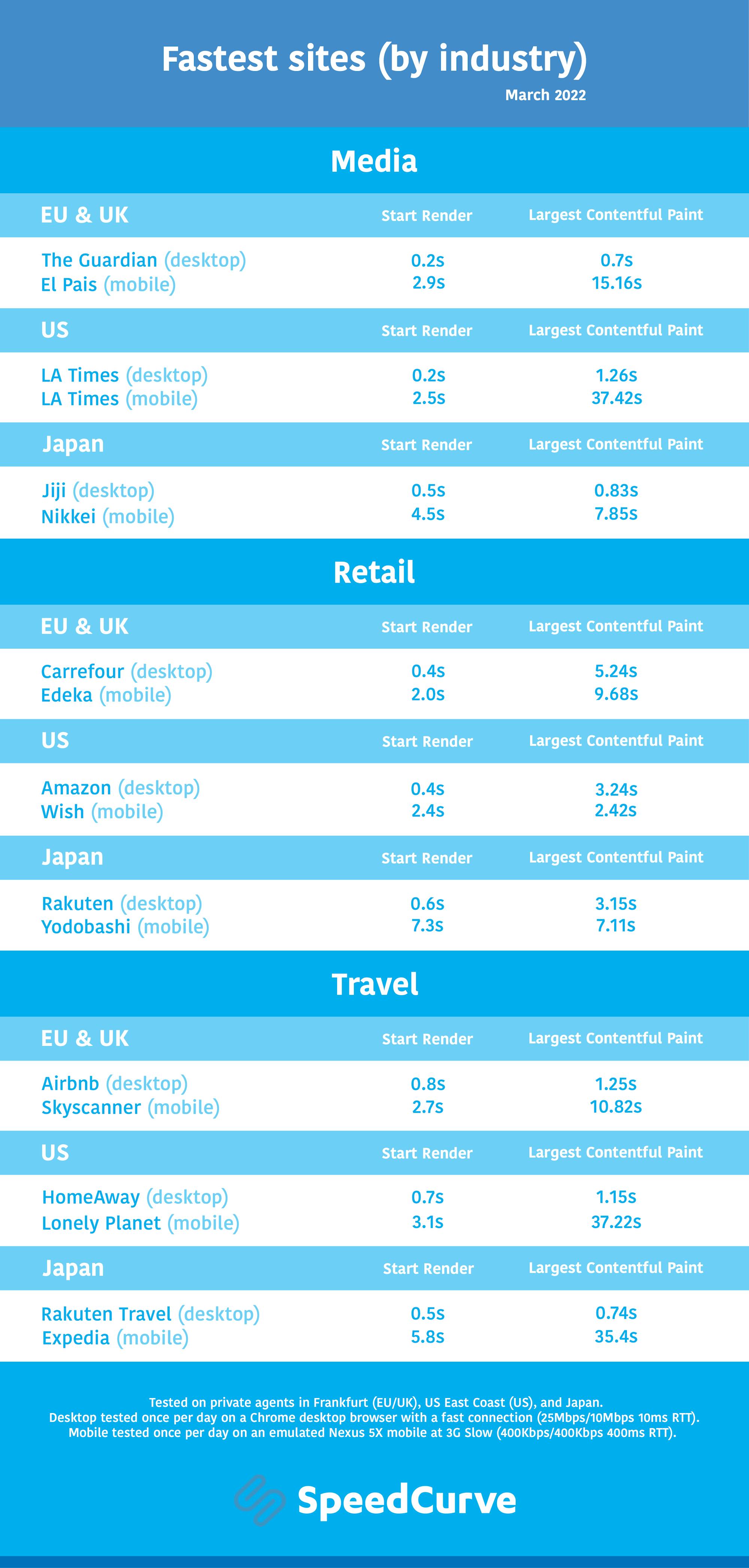 Page Speed Benchmarks is an interactive dashboard that lets you explore and compare web performance data for leading websites across several industries – from retail to media – over the past year. This dashboard is publicly available (meaning you don't need a SpeedCurve account to explore it) and is a treasure trove of meaningful data that you can use for your own research.