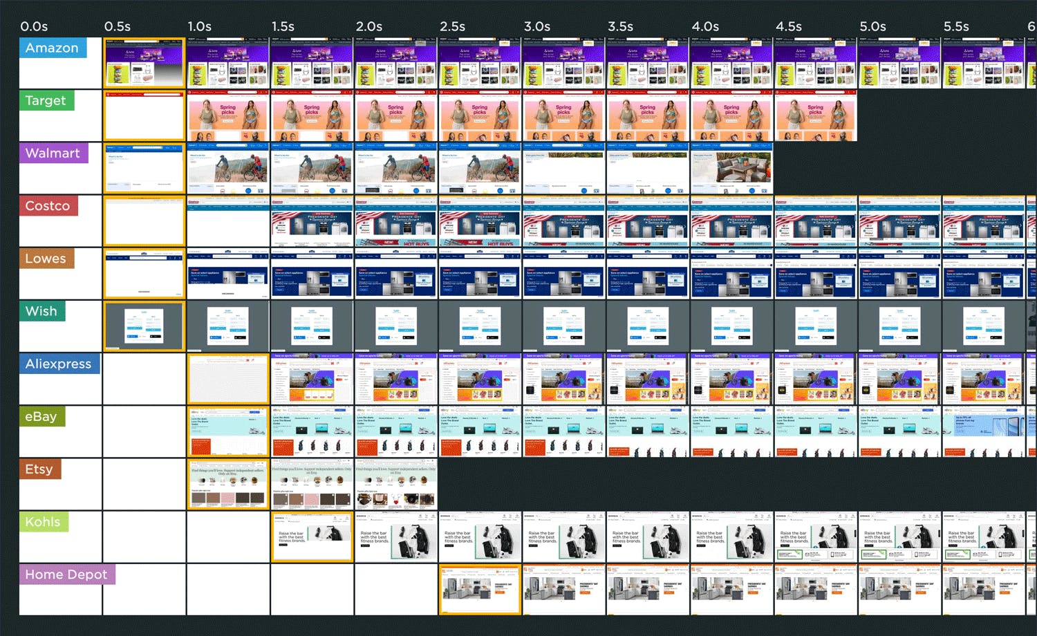 Amazon is a good example of a site that serves large, fast pages. In this recent test run from our Industry Page Speed Benchmarks, you can see that the Amazon home page ranks fastest in terms of Start Render. This is despite the fact that the page contains 410 requests and weighs in at 4,311 KB – far beyond the median sizes shared above. Yet the page has a Start Render time of 0.3 seconds, a Largest Contentful Paint time of 0.48 seconds, and a CLS score of 0.1526.
