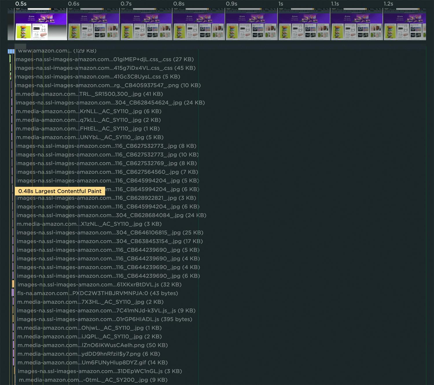 Looking at a close-up of Amazon's waterfall chart (below) reveals why. While there are 38 resources that load before Largest Contentful Paint, only one of them is render blocking, and all of them are extremely lean.