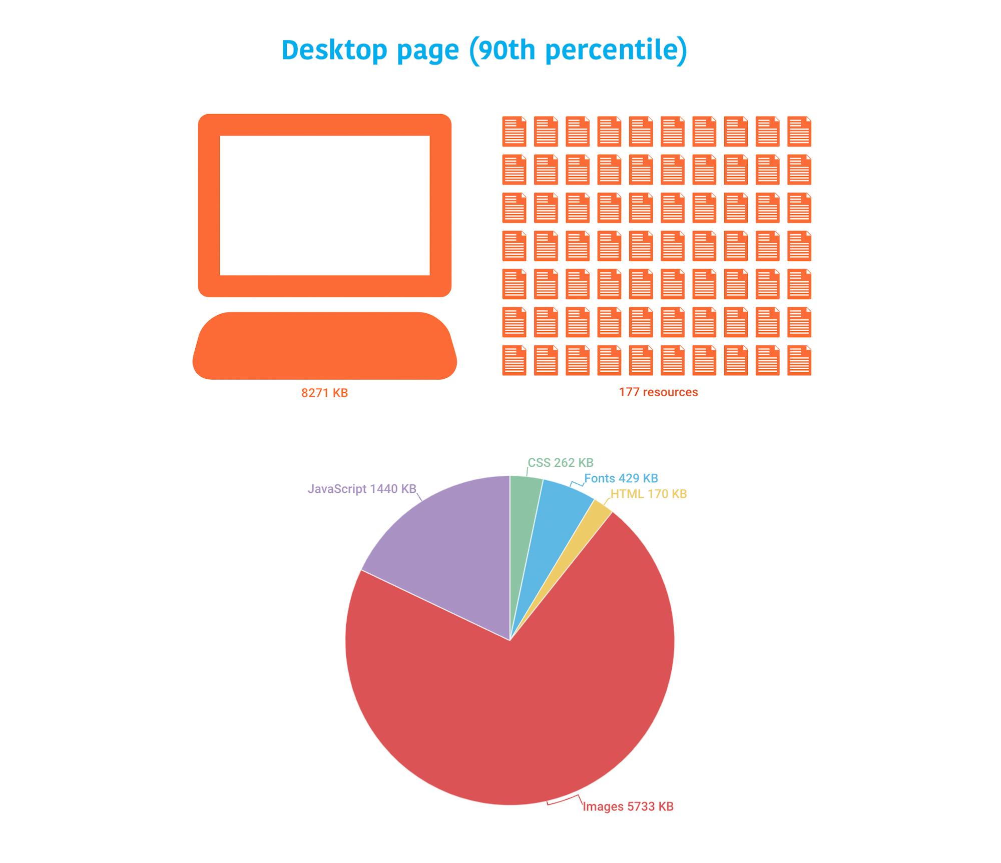 The 90th percentile page served to desktop is 8271 KB and contains 177 resources. Almost 75% of page weight is consumed by images, which add up to more than 5 MB.