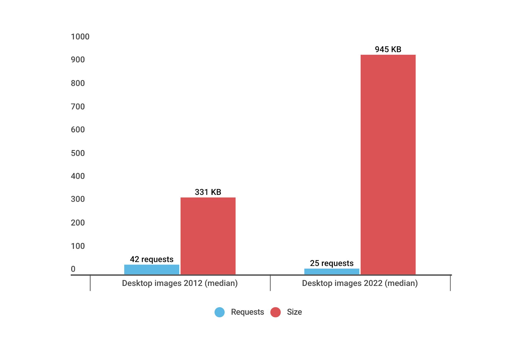 We're serving fewer images, but the images we are serving are high-resolution and/or unoptimized. The median page today serves 25 images, compared to 42 images back in 2012. While the number of image requests has reduced dramatically, the combined size has increased almost threefold, from 331 KB to 945 KB.