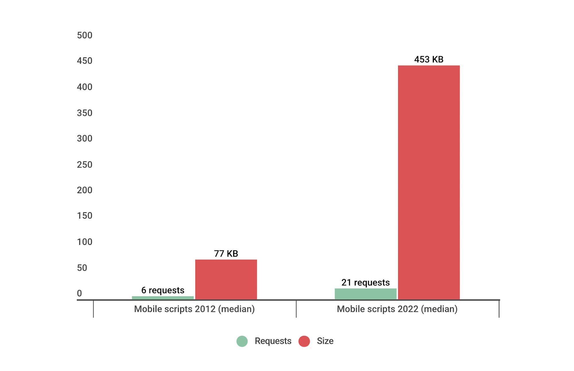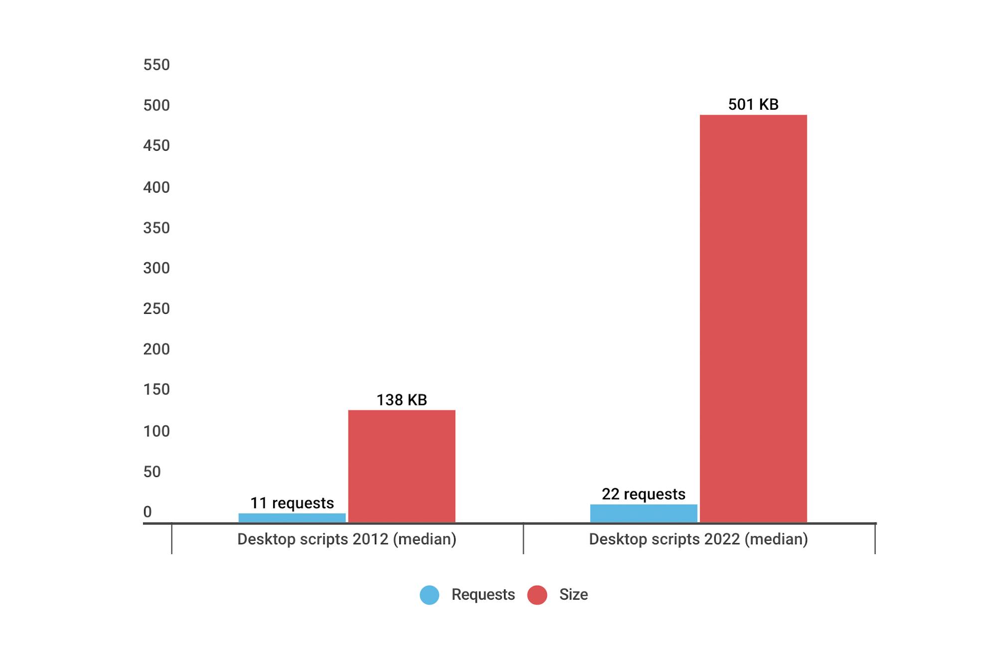Not only are we serving more scripts than ever – with all the performance risks that those entail – we're also bulking out pages with 500 KB of JS weight.