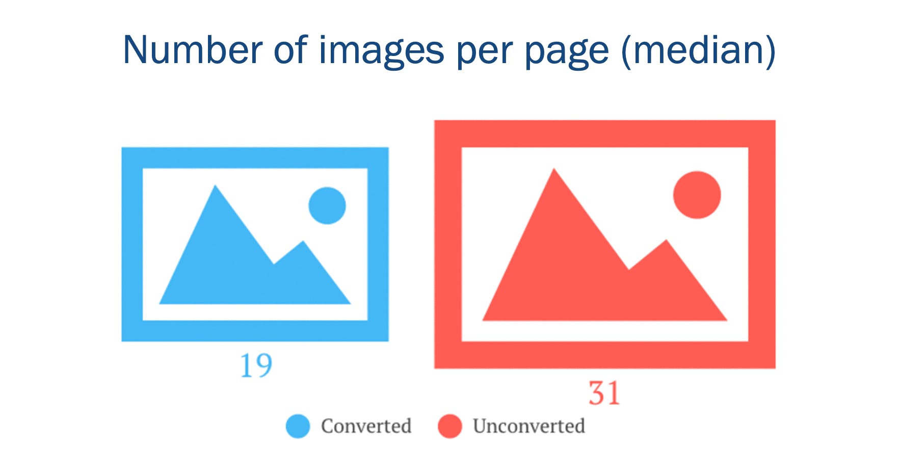 - Images – Often the greatest contributor to page bloat. Looking at the 90th percentile of the distribution of page weight, images account for a whopping 5.7 MB of a roughly 8.2 MB page. In other words, images comprised almost 75% of the total page weight. And if that already wasn’t enough, the number of images on a page has been linked to lower conversion rates on retail sites. (More on that later.)