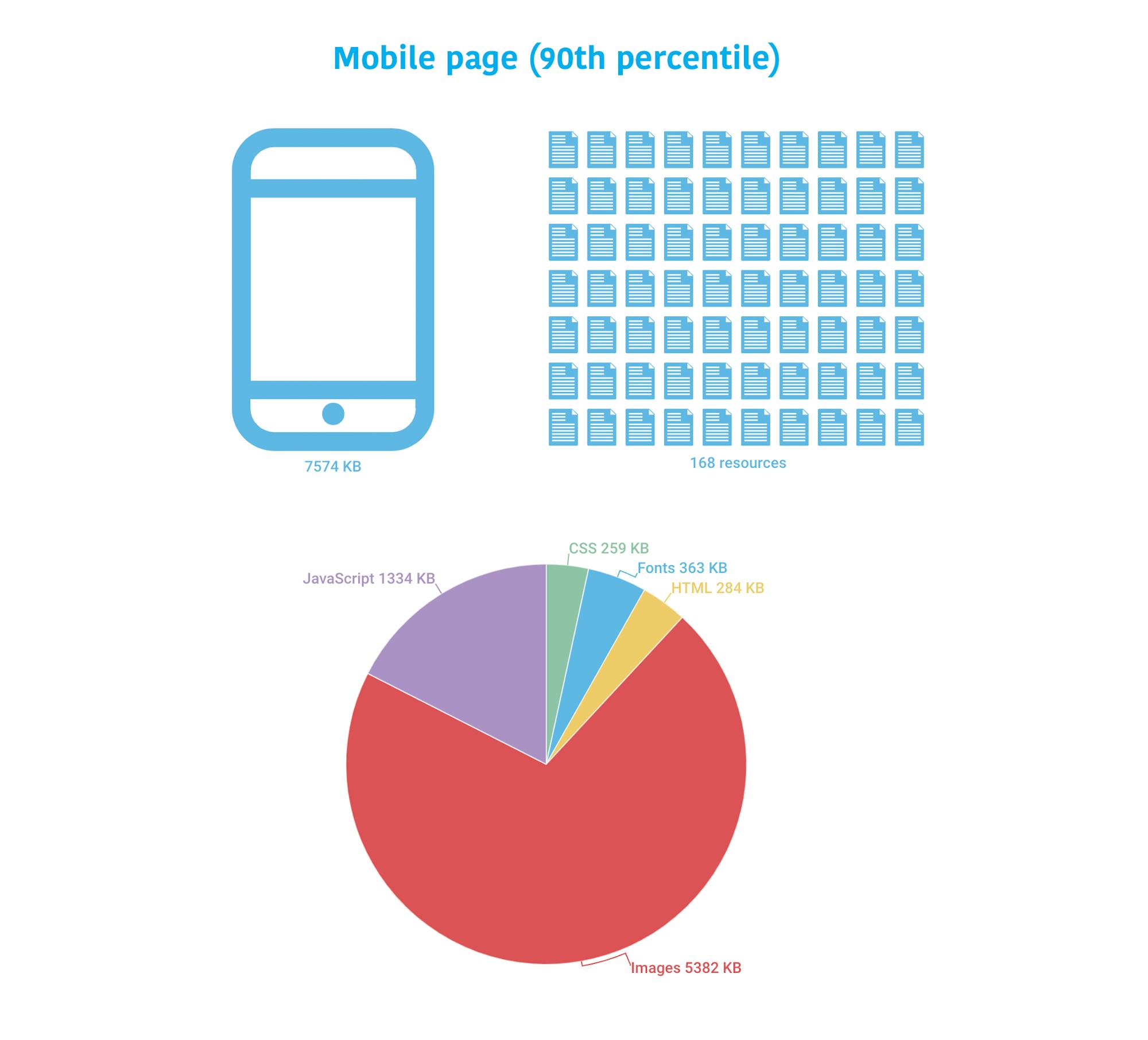 The 90th percentile page served to mobile is only slightly smaller, at 7574 KB and 168 resources.