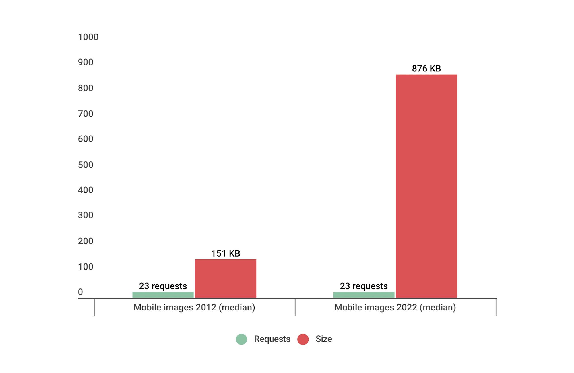 This trend carries over to mobile. The number of image requests has remained the same, but in this case the total image size has increased almost 6X – from 151 KB to 876 KB.