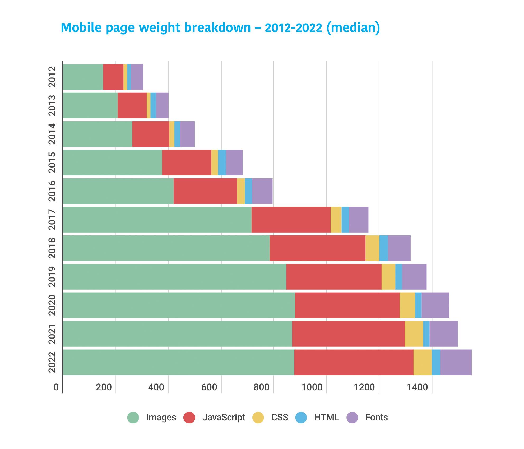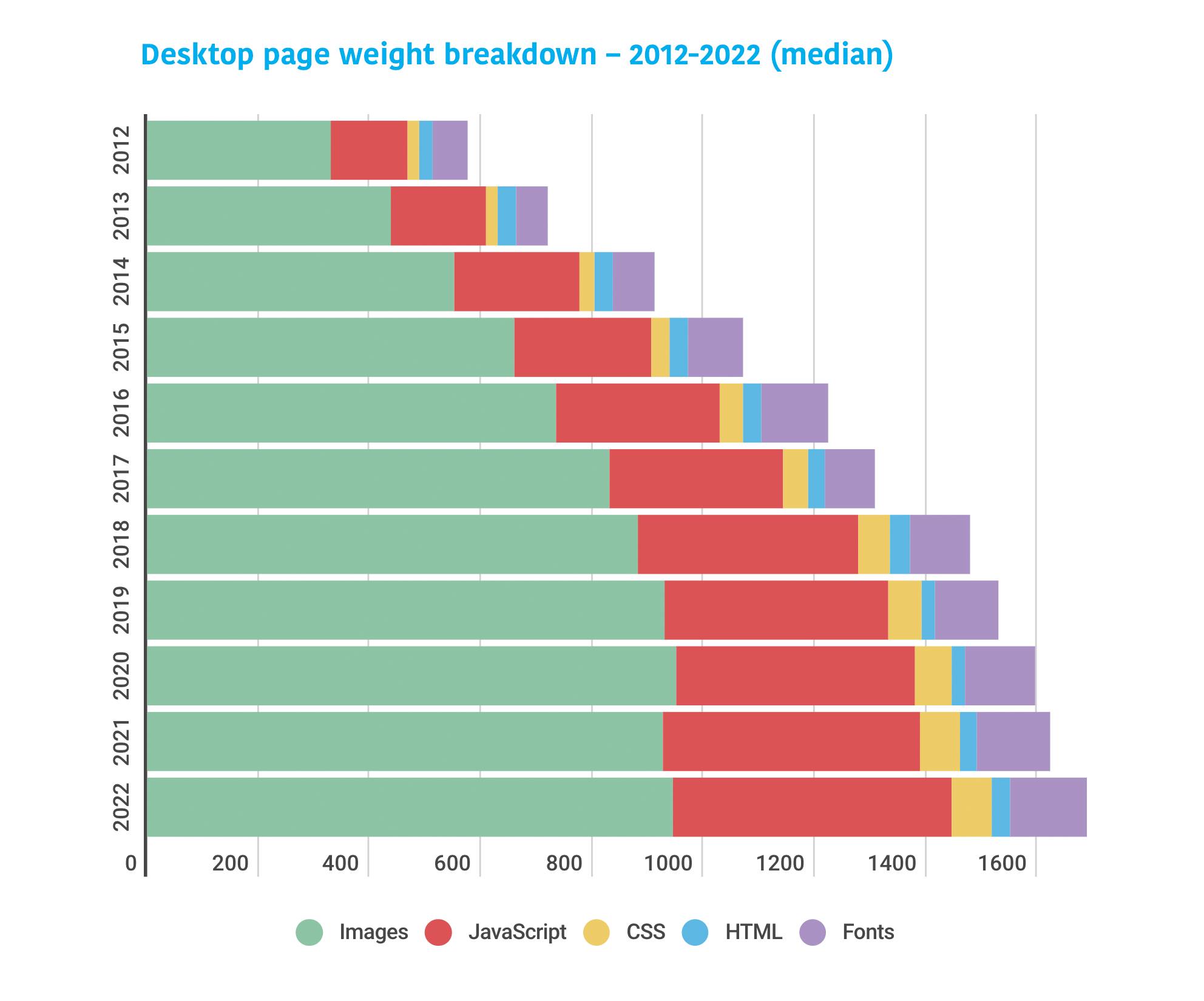 Predictably, much of this page growth is driven by images and JavaScript. Images account for roughly 945 KB (44%) of median desktop page weight, and JS accounts for about 500 KB (23%).